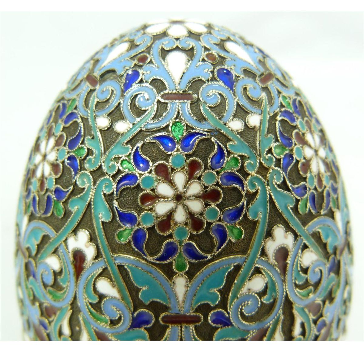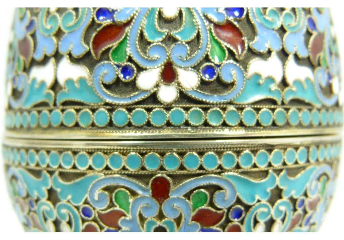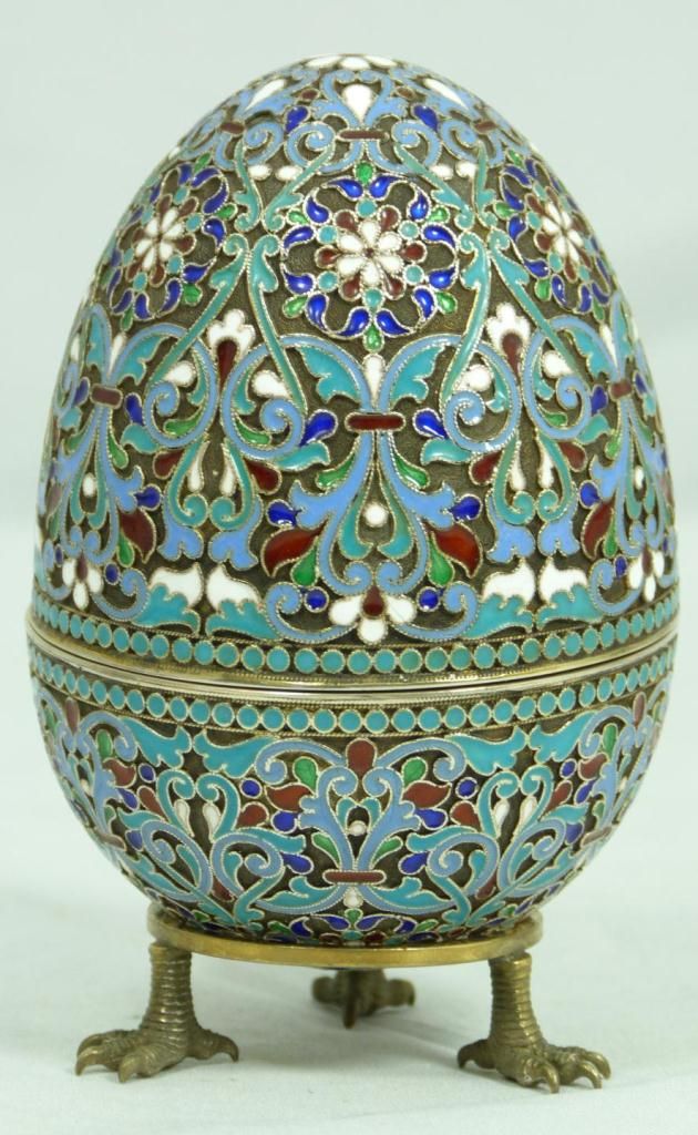 A Russian silver enameled egg box having scrolled floral design throughout. Gold wash interior. Includes stand with three figural eagle feet. Piece holds Ivan Petrovich Khlebnikov workmaster marks. Holds 84 silver purity mark with town mark. Holds marks to both sides of interior and lip. Base marked 84. Measures 3 1/2" height + 3/8" base height (8.9cm x .95cm). Total weight of 5.24ozt.
