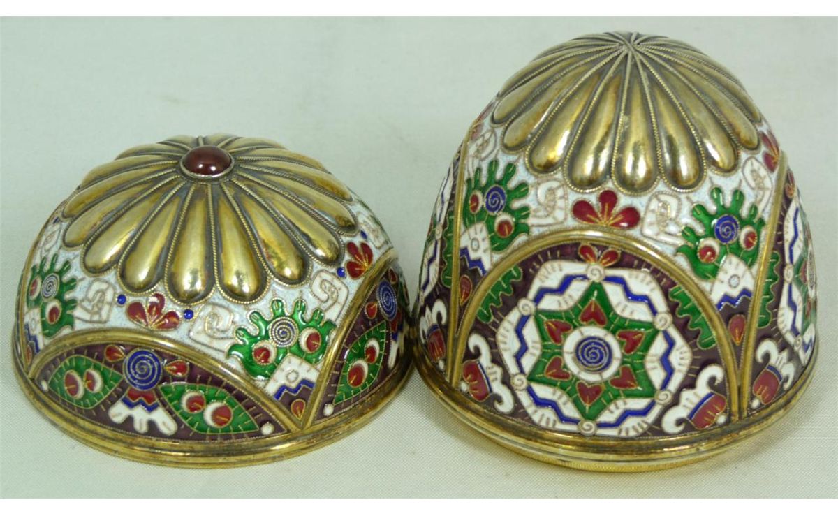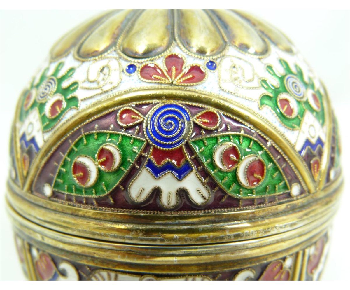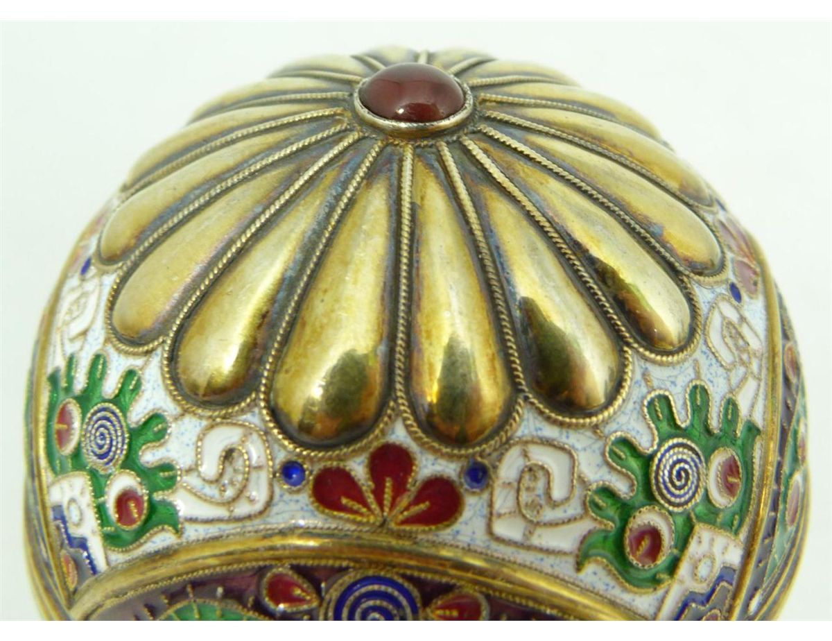 Finely crafted Russian silver egg with multicolor enameled design throughout. Has Cabochon ruby to end. Workmaster marks, town marks and 84 silvery purity mark. Includes silver figural tripod swan foot stand. Egg measures 3 1/2" height + 1/2" base height (8.9cm + 1.2cm). Weighs 5.24 ounces troy.