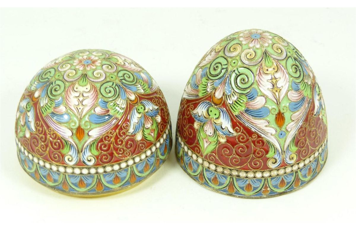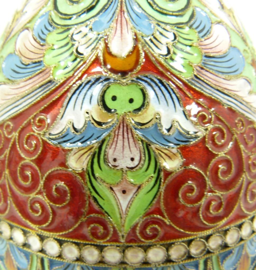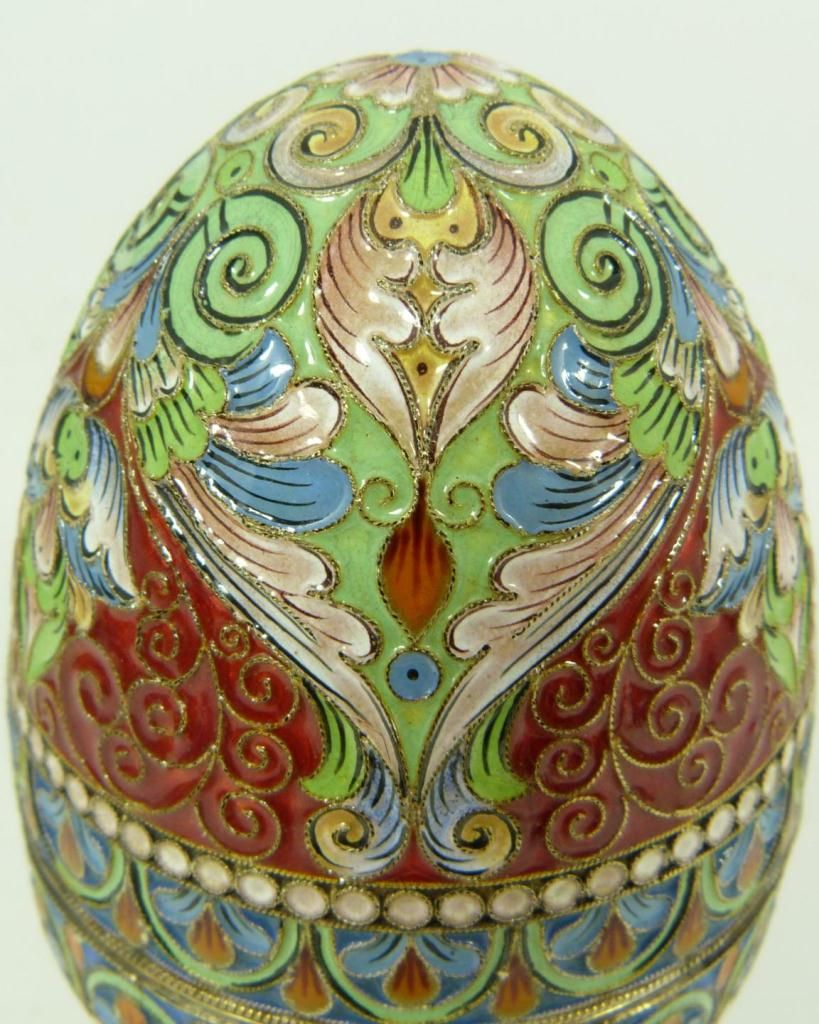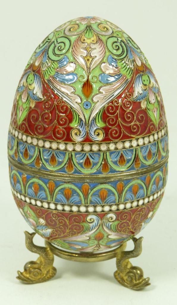 Russian silver enameled egg box having elegant scrolled floral design. Gold wash interior. Includes stand with three figural fish feet. Piece holds double headed eagle marks. Holds 88 silver purity mark with Moscow town mark and workmaster mark. Holds marks to both sides of interior. Base marked 84. Measures 3 1/2" height + 1/2" base height (8.9cm x 1.2cm). Total weight of 5.8ozt.