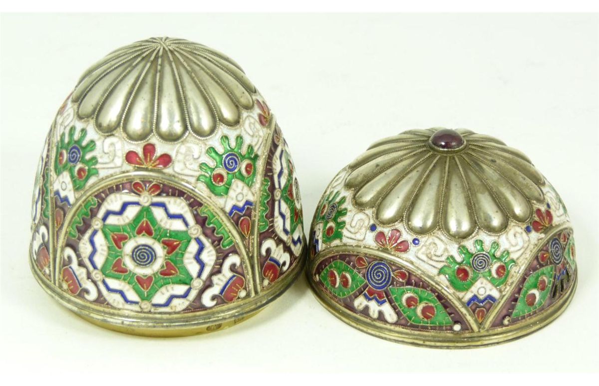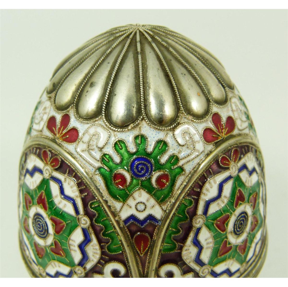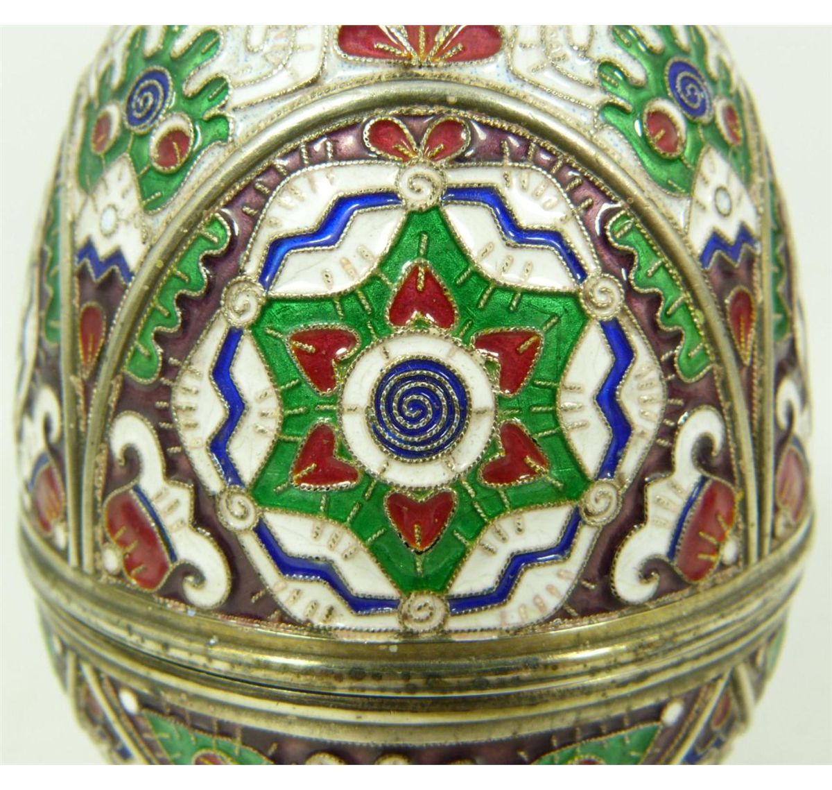 Russian silver egg with multicolor enameled design throughout. Has Cabochon ruby to end. Holds workmaster marks, town marks and 84 silvery purity mark. Includes silver figural fish footed stand. Egg measures 3 1/2" height + 1/4" base height (8.9cm + .6cm). Weighs 4.7ozt.