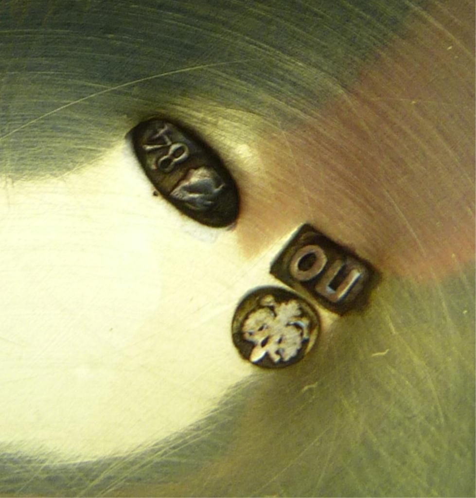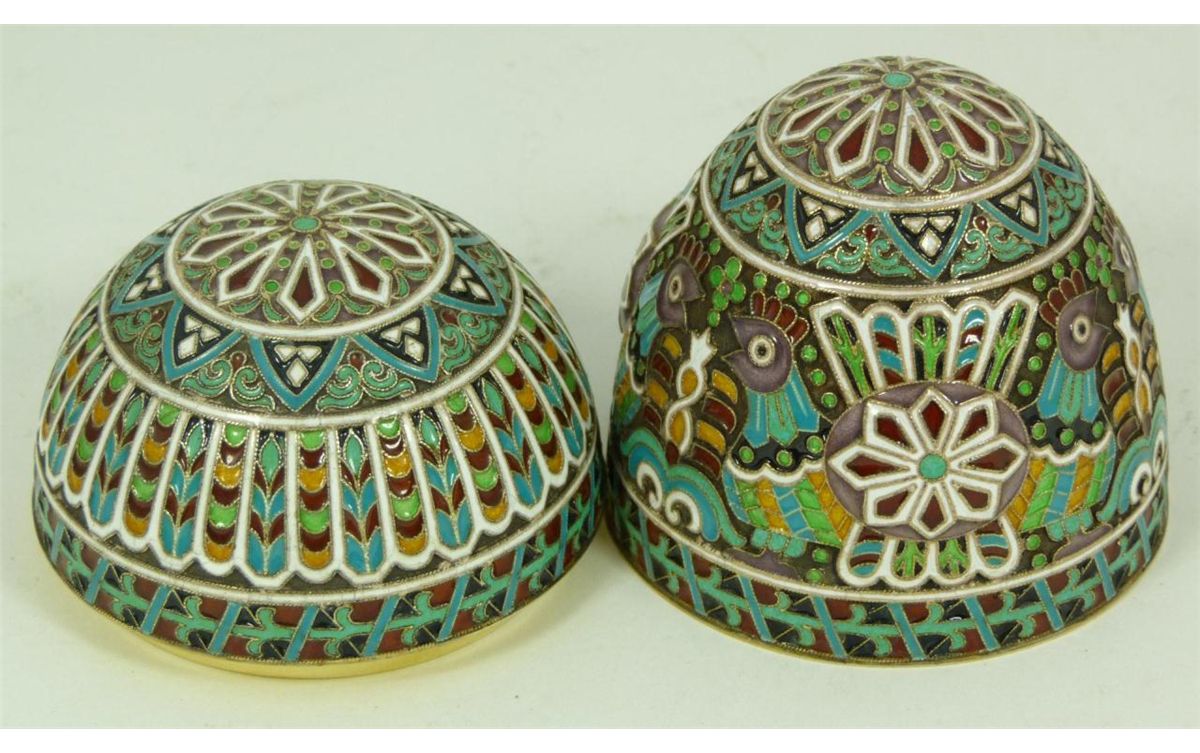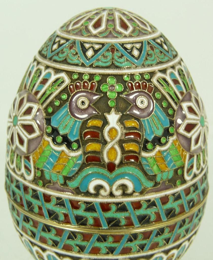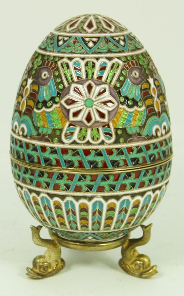 Russian silver enameled egg box having elegant scrolled design with chickens and raised pinwheels. Gold wash interior. Includes stand with three figural fish feet. Piece holds Cyrillic Pavel Akimov Ovchinnikov workmaster marks. Holds 84 silver purity mark with Moscow town mark and Double headed eagle mark. Holds marks to both sides of interior and on lip. Base marked 84. Measures 3 1/2" height + 5/8" base height (8.9cm + 1.5cm). Total weight of 5.7ozt.
