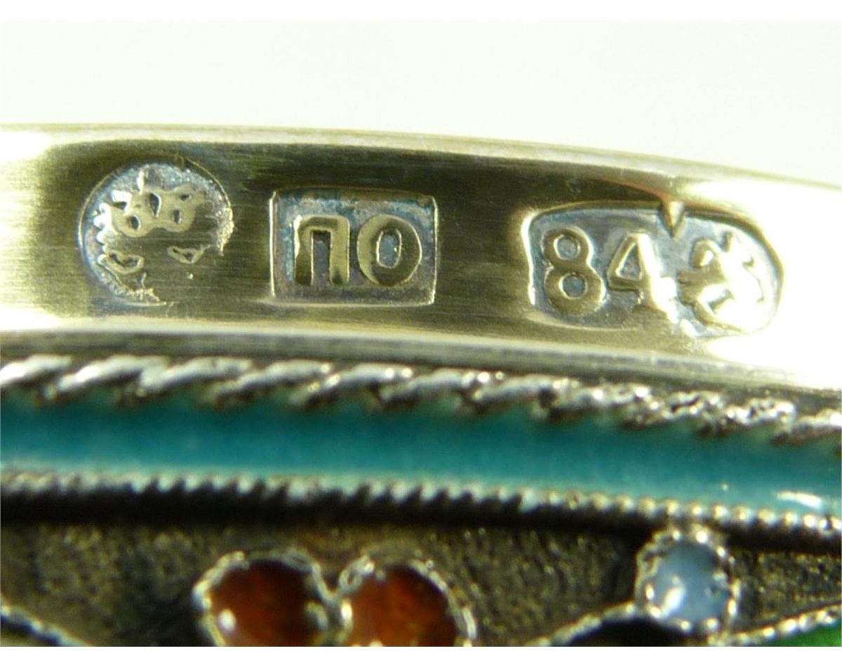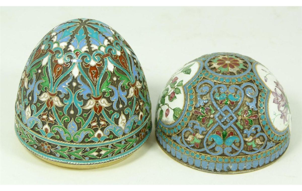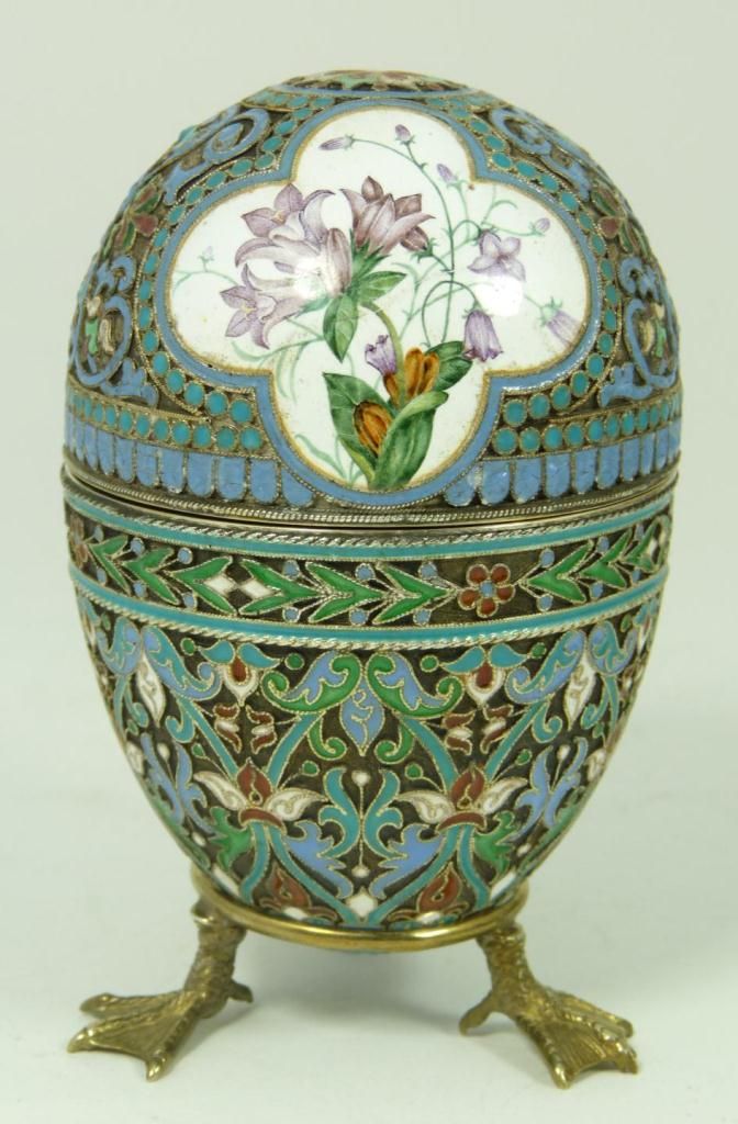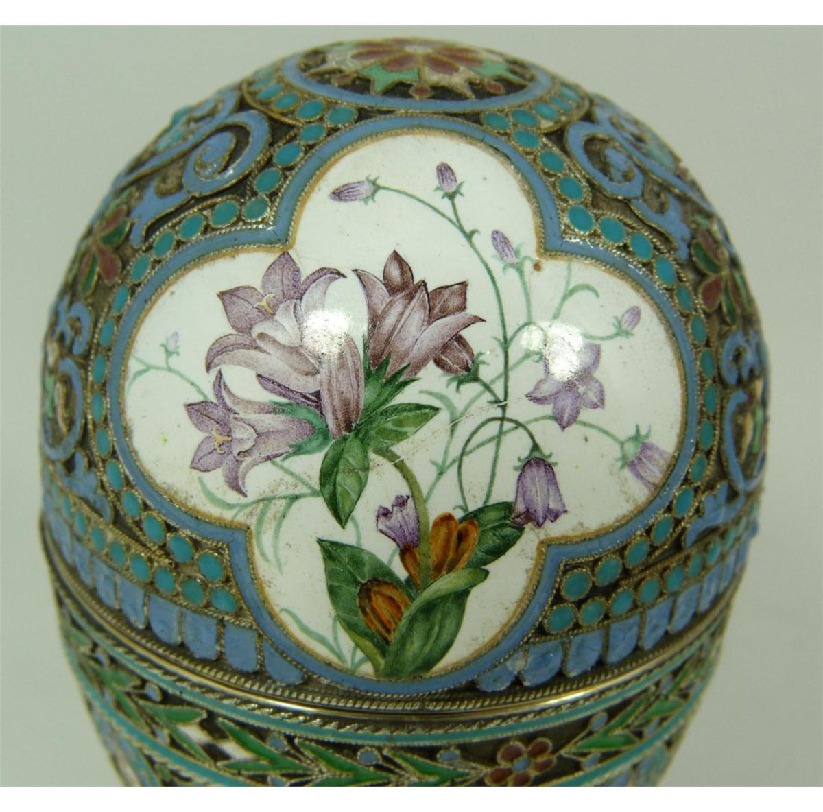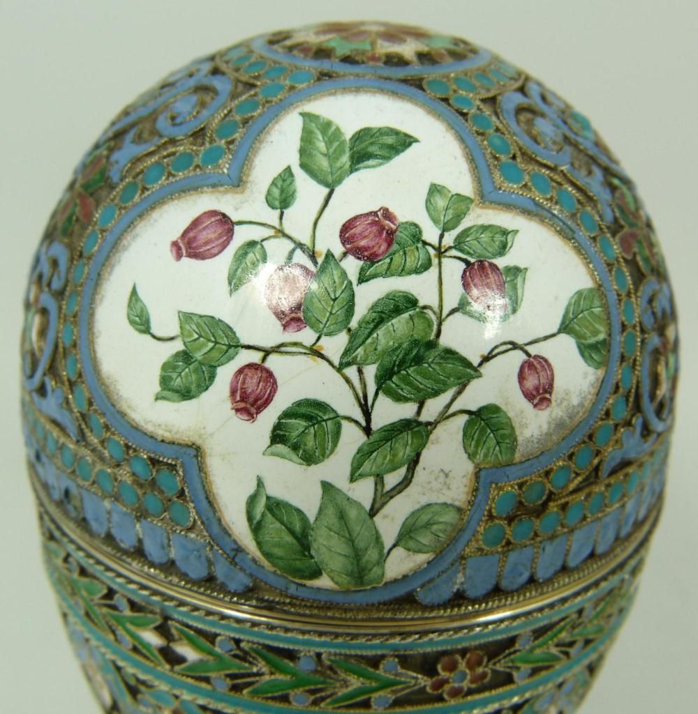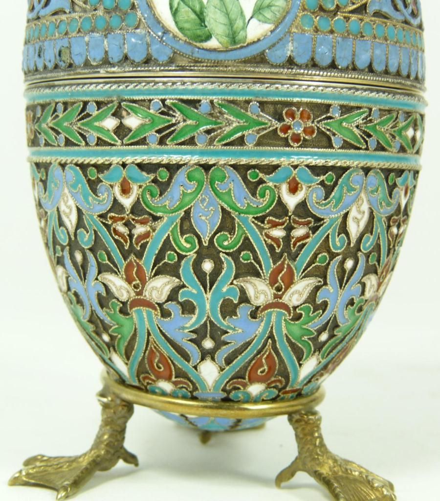 Russian silver enameled egg box having two floral miniatures. Gold wash interior. Includes stand with three figural duck form feet. Piece holds Cyrillic Pavel Akimov Ovchinnikov workmaster marks. Holds 84 silver purity mark with Moscow town mark and Double headed eagle mark. Holds marks to both sides of interior and on lip. Base marked 84. Measures 3 5/8" height + 5/8" base height (9.2cm + 1.5cm). Total weight of 5.7ozt.