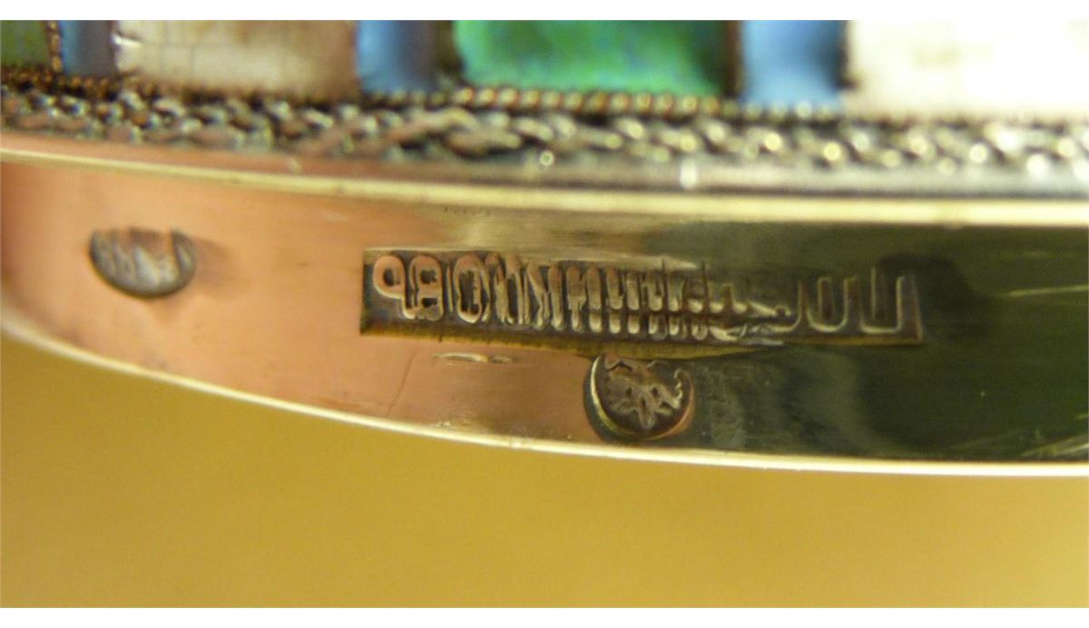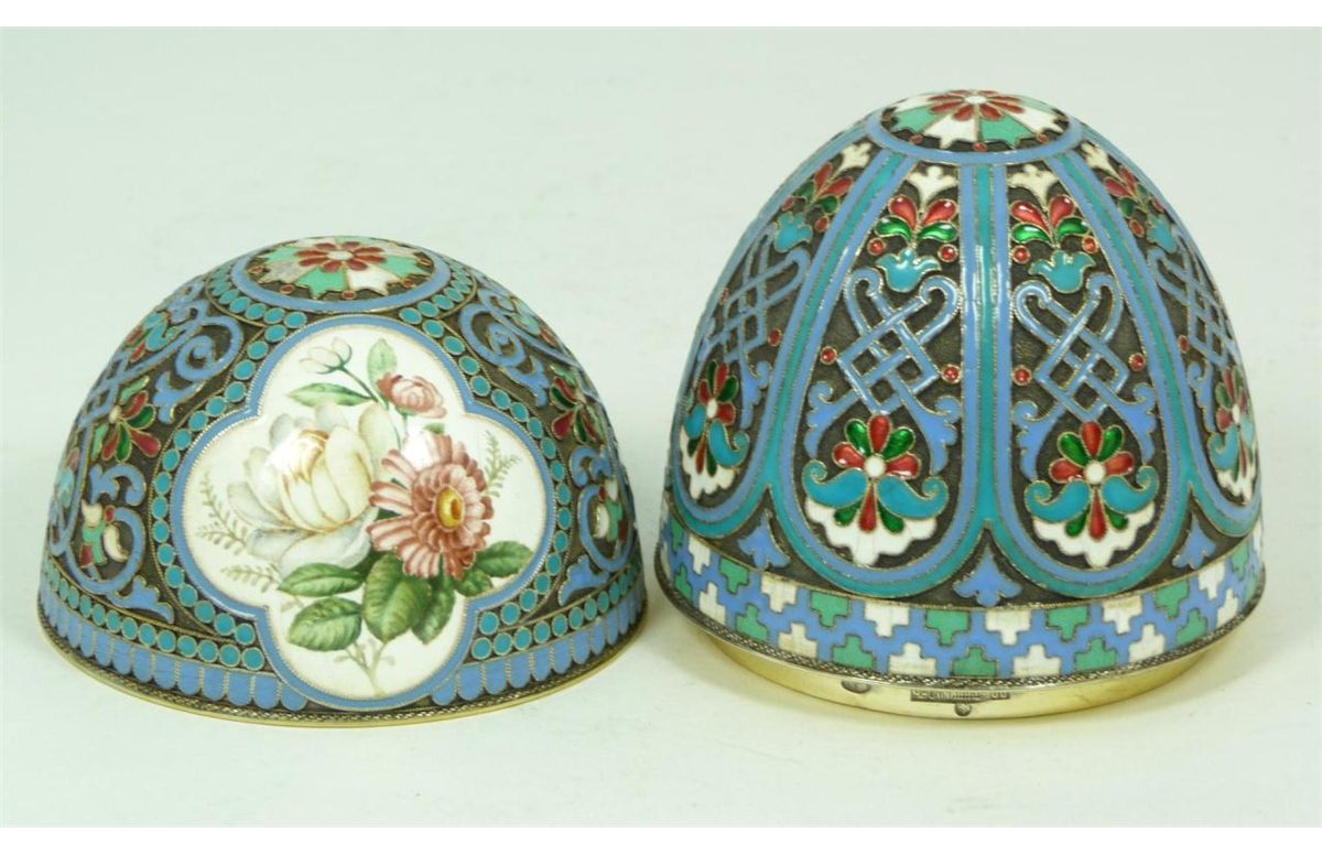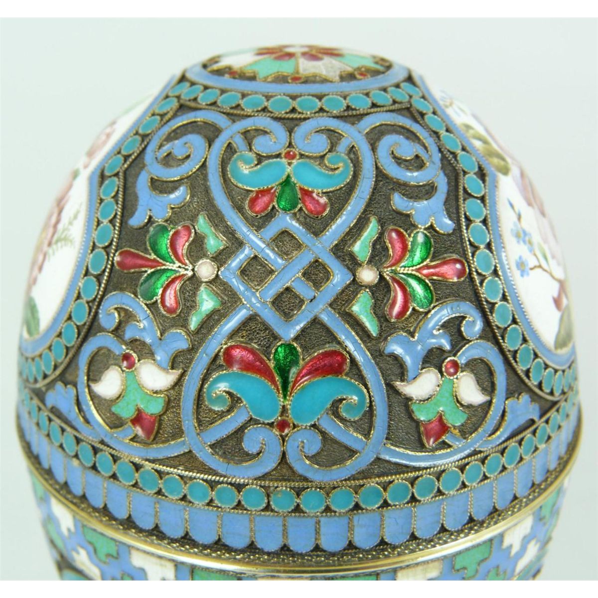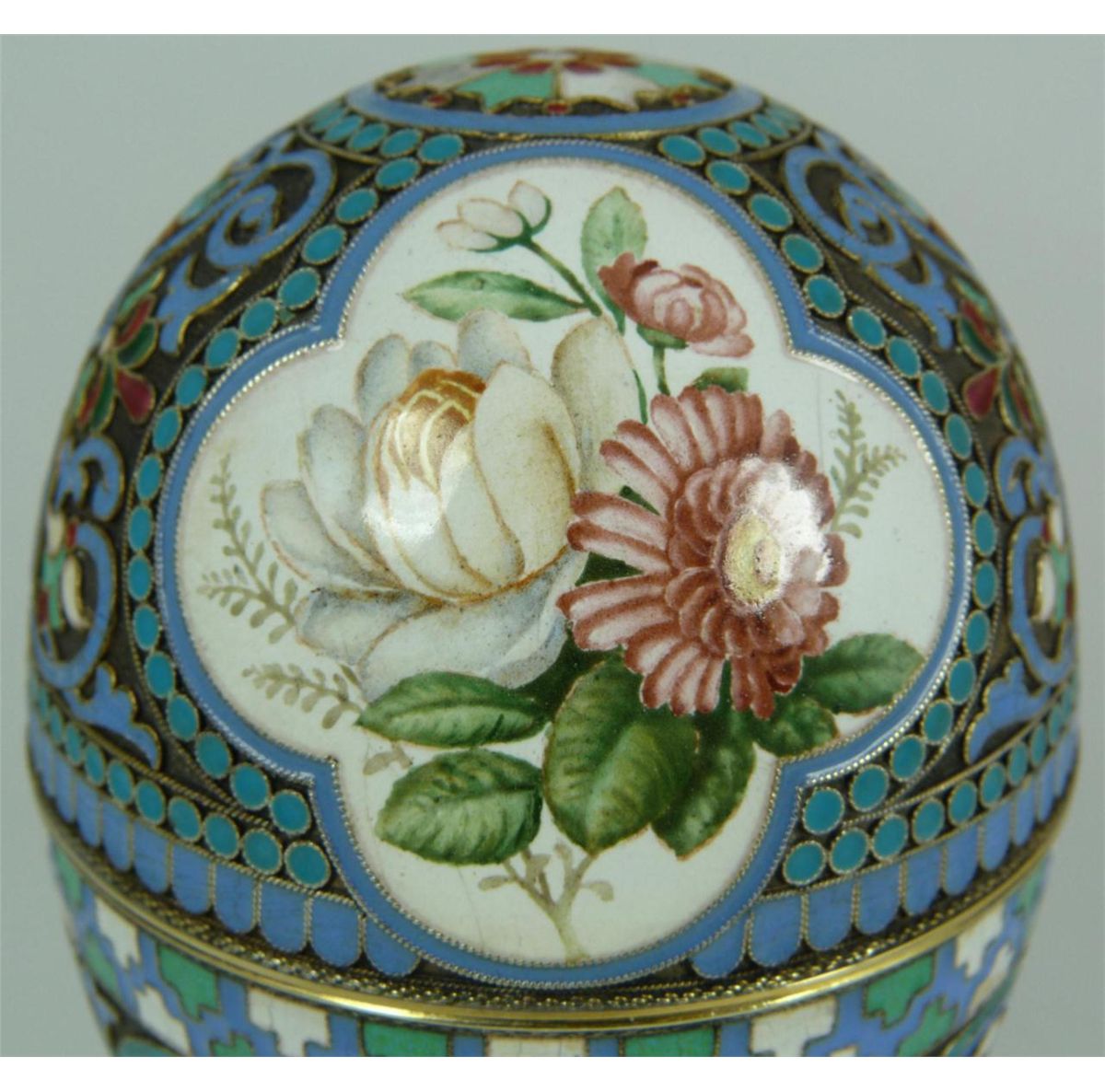 Russian silver enameled egg box having two floral miniatures. Gold wash interior. Includes stand with three figural eagle feet. Piece holds Cyrillic Pavel Akimov Ovchinnikov workmaster marks. Holds 88 silver purity mark with Moscow town mark and Double headed eagle mark. Base marked 84. Measures 4" height + 1 3/4" base height (10.1cm + 4.4cm). Total weight of 9.1ozt.