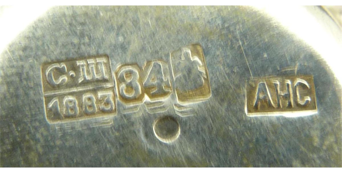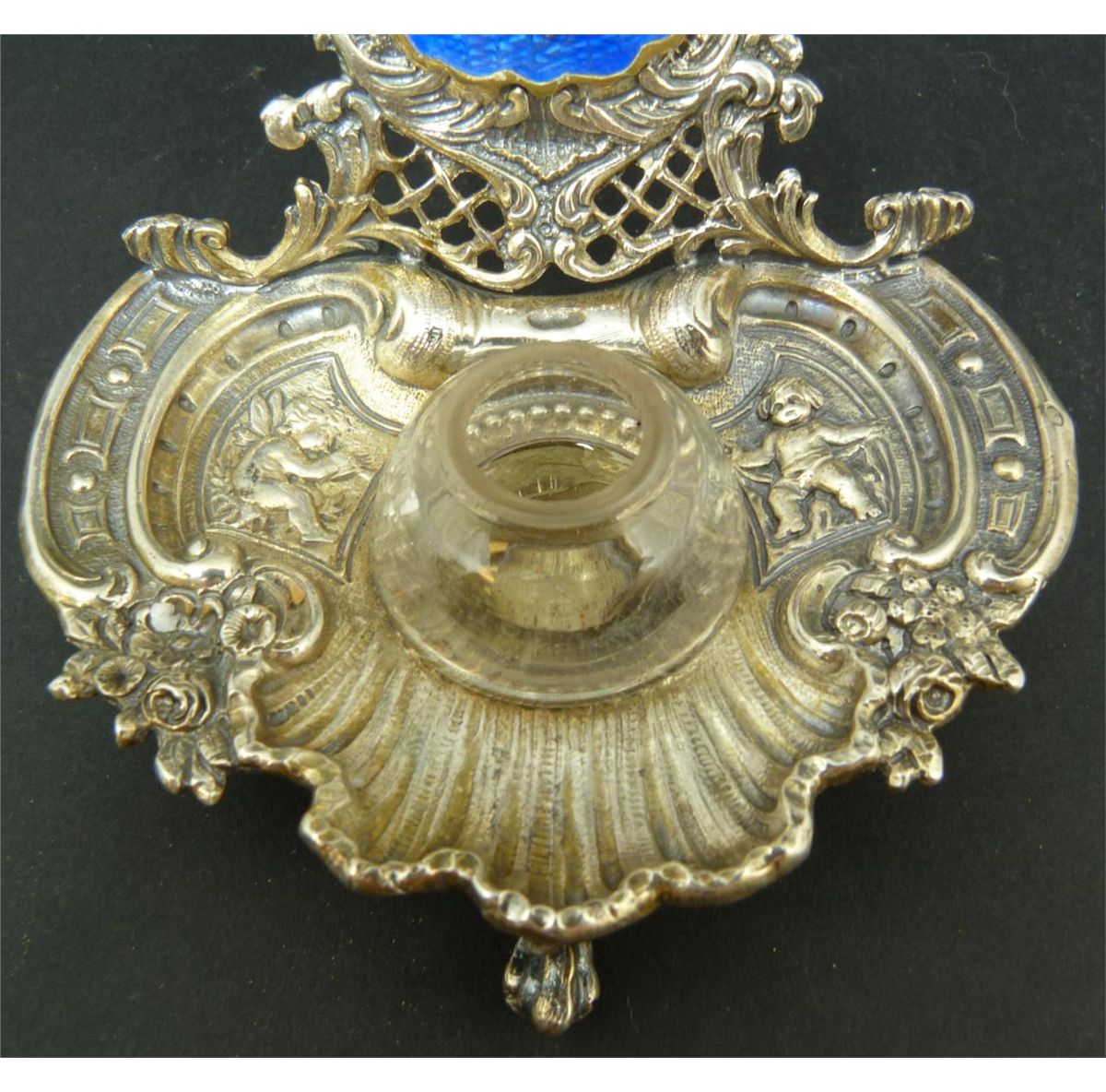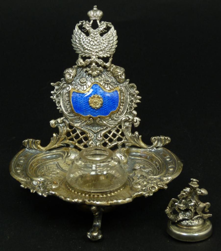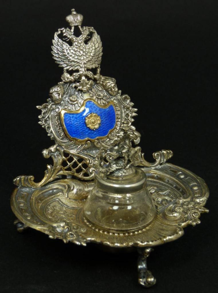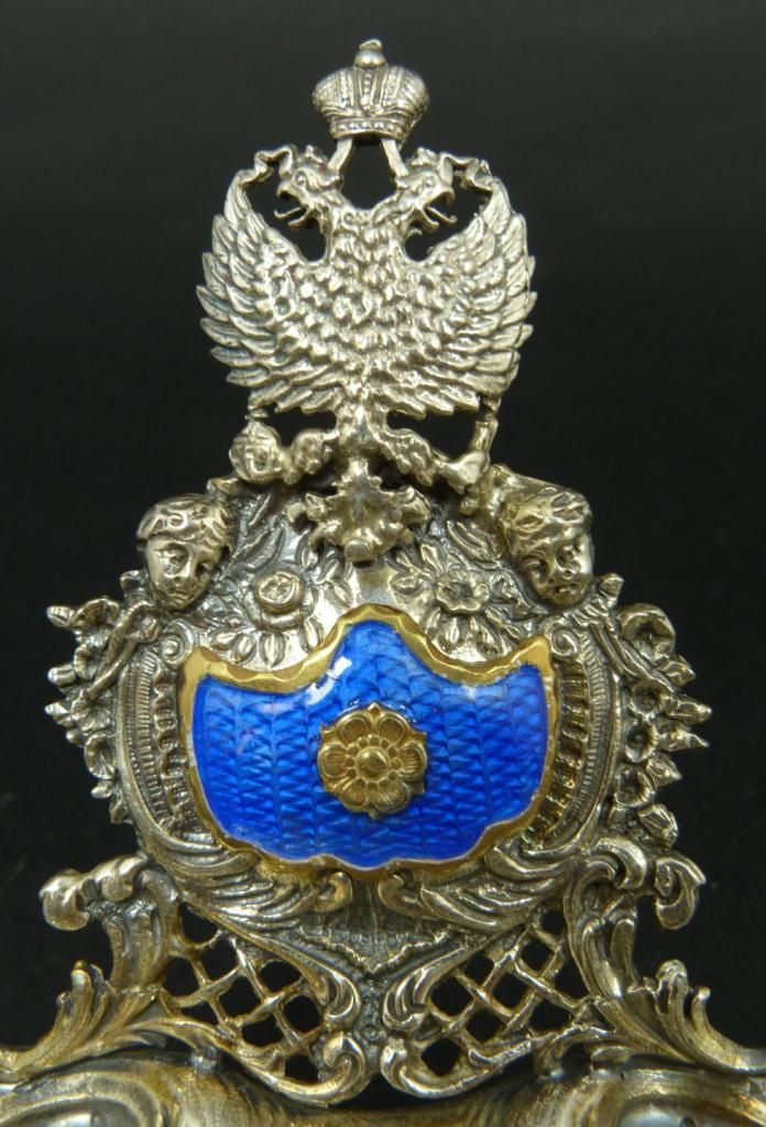 Old Russian silver vanity scent piece having a figural lion's paw tripod design. Has guilloche cobalt blue design to backing with lattice work, cherub heads with double headed eagle finial to backing. Holds CW 1893 assayer's marks with 84 silver purity marks and town marks. AHC workmaster marks. Measures 3 7/8" height x 3 7/8" width x 4" depth (9.8cm x 9.8cm x 10.1cm). Total weight of 4.47ozt.