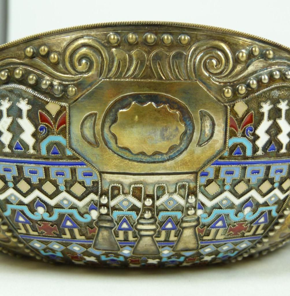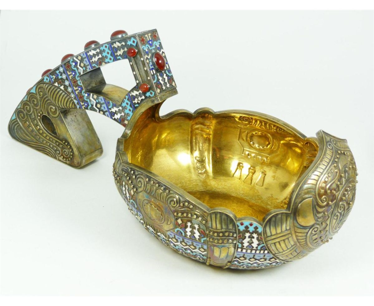 A large Russian silver kovsh having a multicolor enameled design throughout with overlay filigree strands and raised beaded designs. Handle set with 10 oval cabochon cut carnelian jewels. Holds Double Headed Eagle cipher mark with 84 silver purity marks and St. Petersburg town marks. Holds Cyrillic Pavel Sazikov workmaster marks with 1889 Anatoliì Apollonovich Artsibashev Assayer marks. Measures 5 5/8" height x 12 5/8" length (14.2cm x 32cm). Total weight of 28.5ozt.