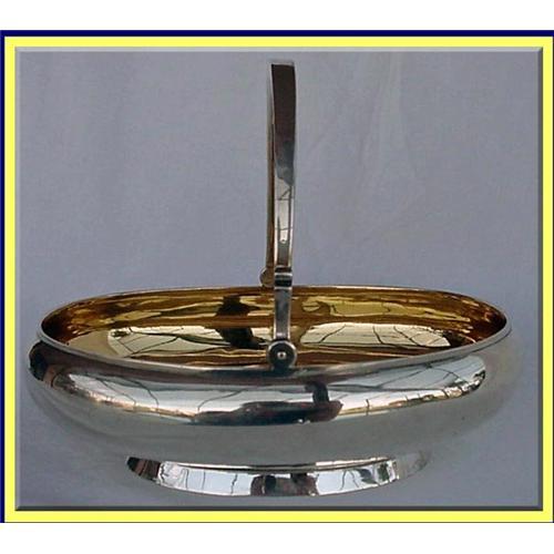 Oval shape. stands on oval base. Handle with little scrolls on the sides near the hinges and widenting towards the top. Inside is richly gilt washed.