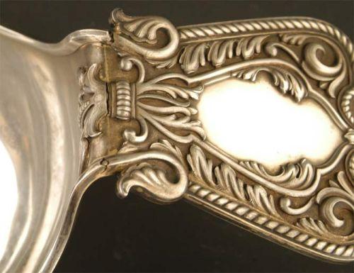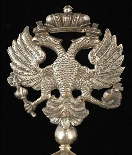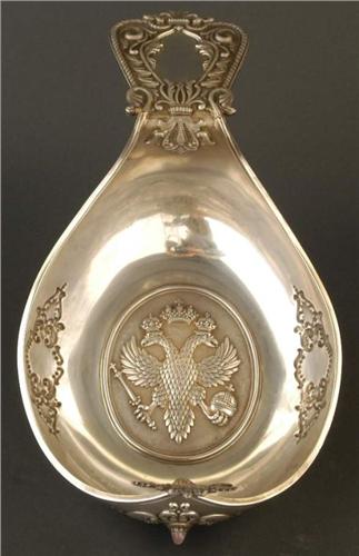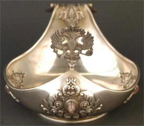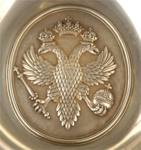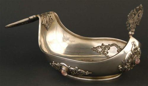 "RUSSIAN SILVER KOVSCH with Imperial double eagle embossed in bottom and on finial, 16"" long, 1421 grams repair to handle otherwise excellent packing and shipping (excluding insurance) $50"