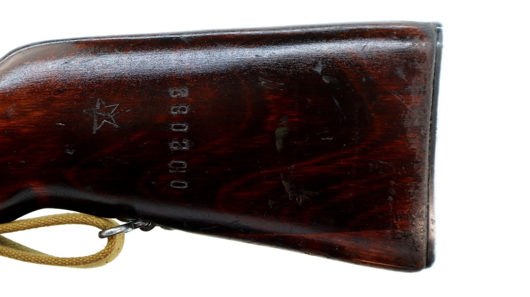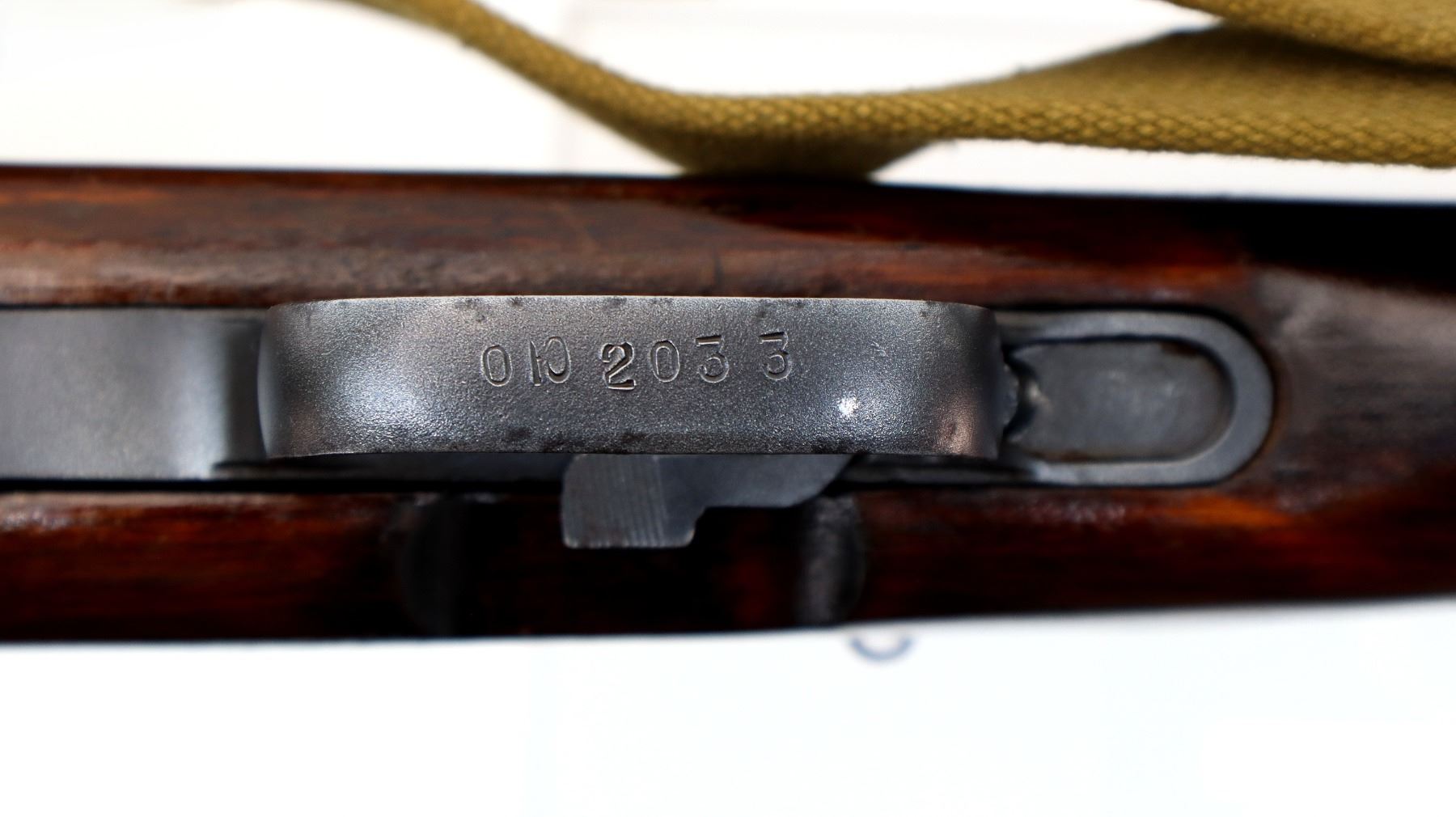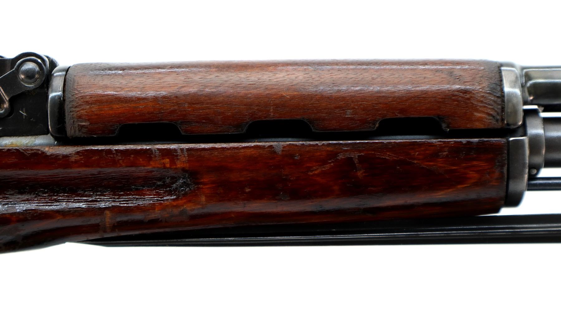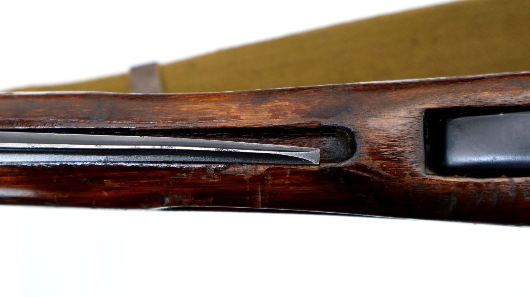 Main Description: Manufactured by Tula 1949, visible numbers match. This rifle has early features, straight gas block, take down lever has the center hole, grooved safety lever, attached folding cruciform bayonet. Post front sight with hood and ramp, adjustable u notched rear sight, blued finish, silver bolt and carrier. Two piece full military wood stocks, ventilated handguard which is loose, finger grooved forearm, pistol grip, smooth steel butt plate with trap and cleaning kit, sling swivels with tan canvas military sling, cleaning rod, stock has arsenal repair at toe.