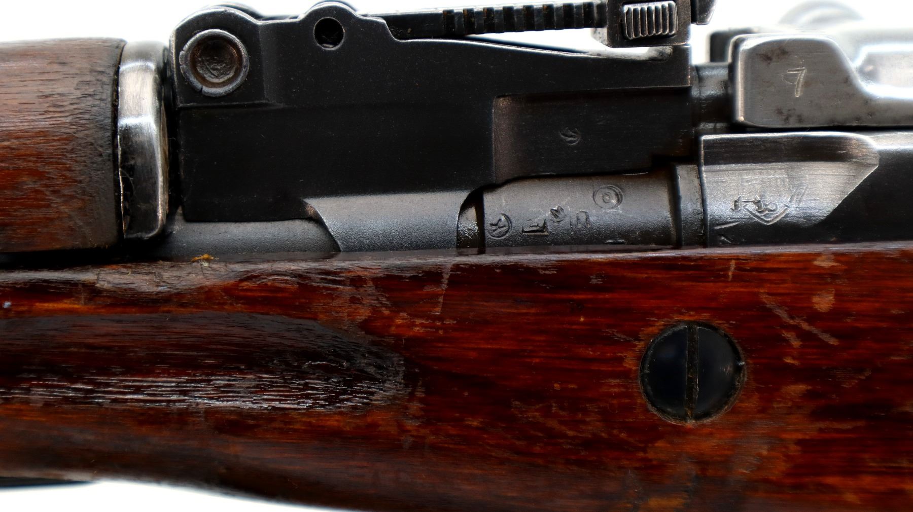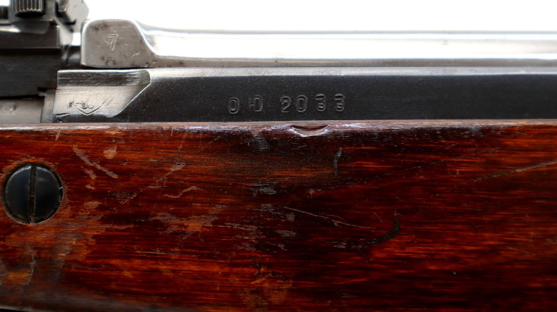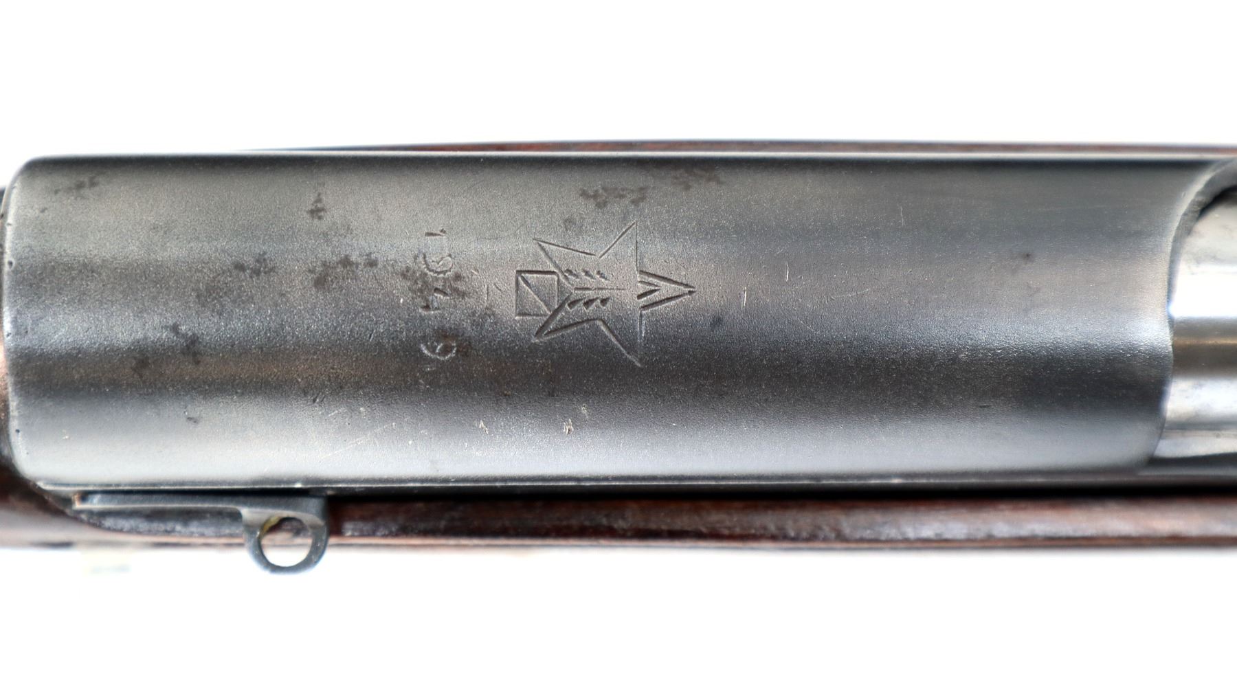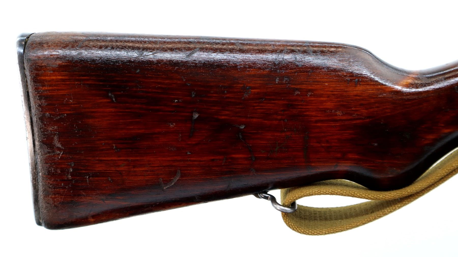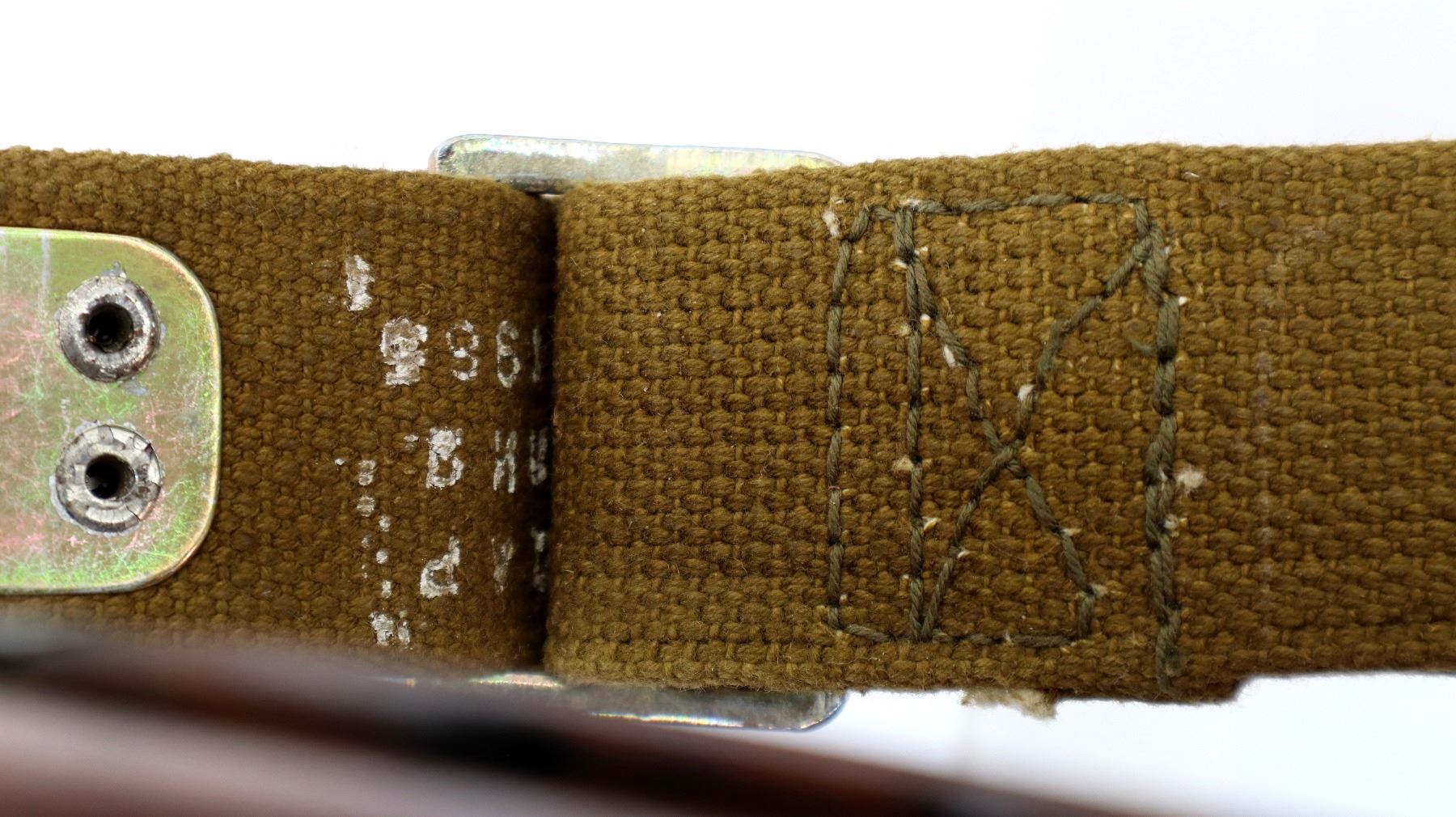 Main Description: Manufactured by Tula 1949, visible numbers match. This rifle has early features, straight gas block, take down lever has the center hole, grooved safety lever, attached folding cruciform bayonet. Post front sight with hood and ramp, adjustable u notched rear sight, blued finish, silver bolt and carrier. Two piece full military wood stocks, ventilated handguard which is loose, finger grooved forearm, pistol grip, smooth steel butt plate with trap and cleaning kit, sling swivels with tan canvas military sling, cleaning rod, stock has arsenal repair at toe.