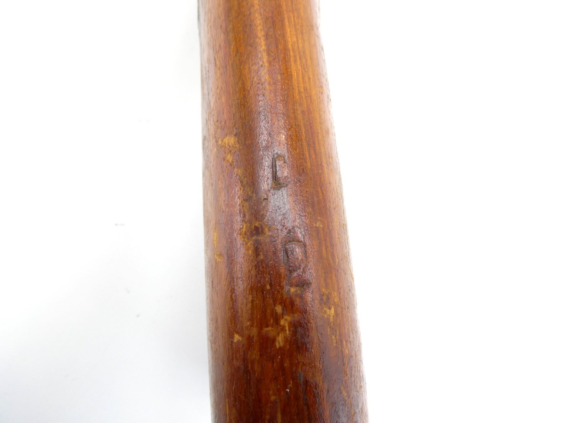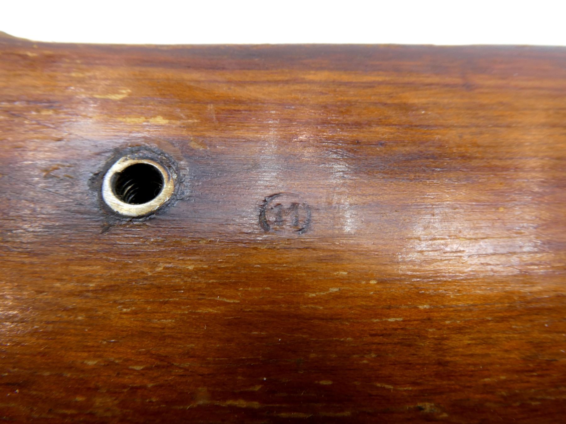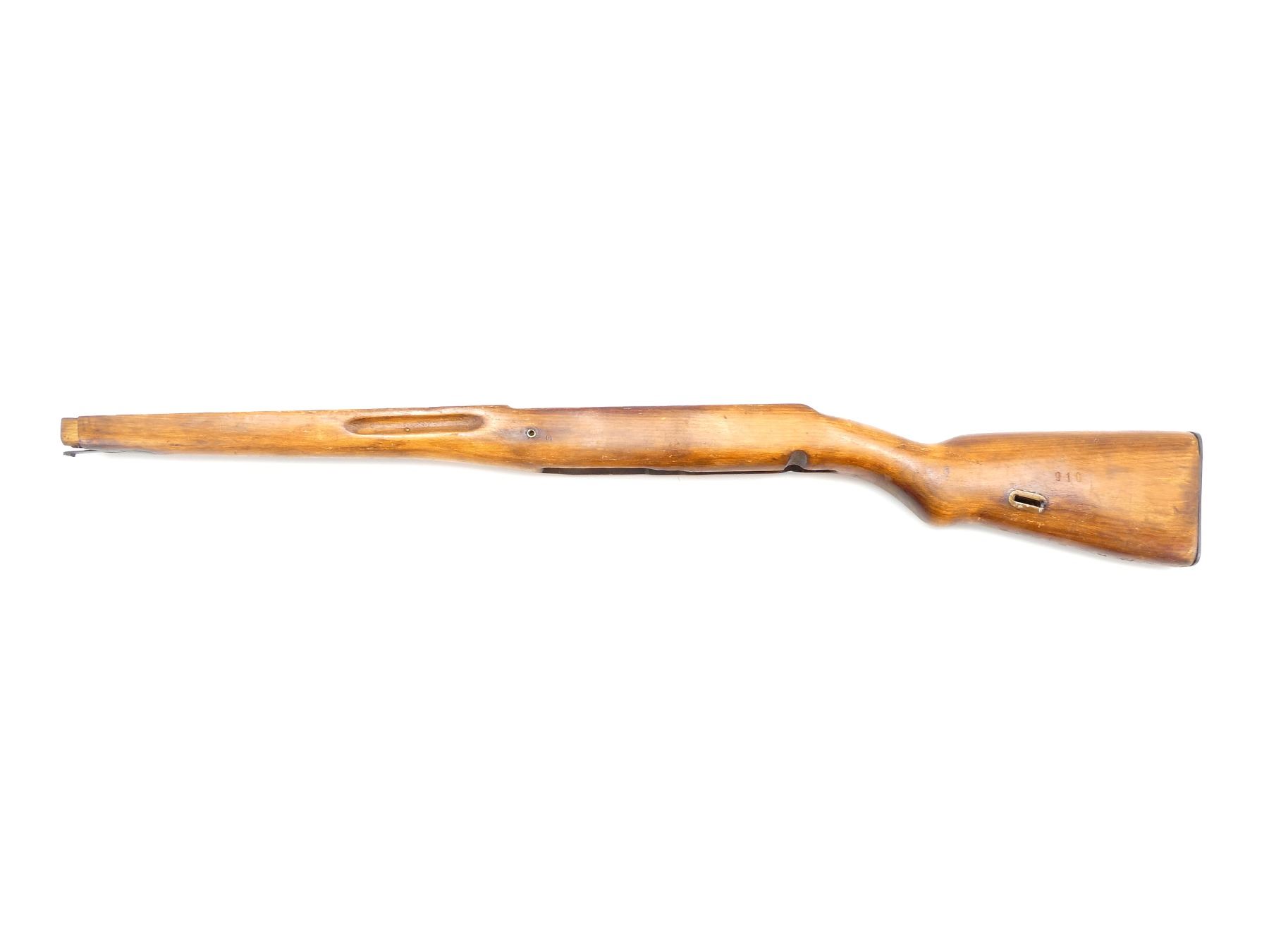 (1) FITS 7.62X54R RIFLES, WOOD CONSTRUCTION WITH PISTOL GRIP, BUTT PLATE & BARREL BAND SPRING, VARIOUS PROOF MARKS, CHIP AT RECOIL LUG, OAL APPROX. 35". MAY REQUIRE FITTING. SEE PHOTOS.