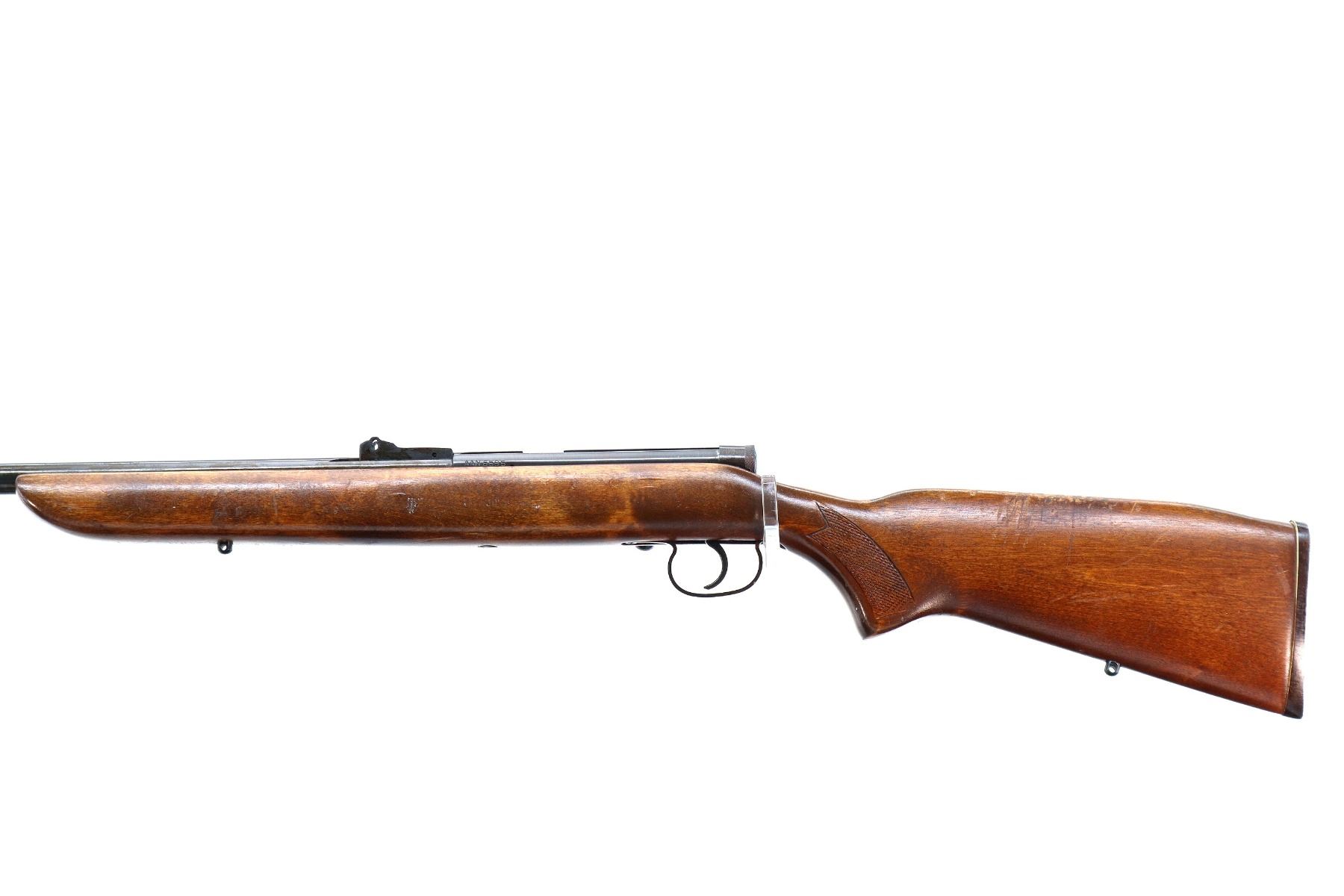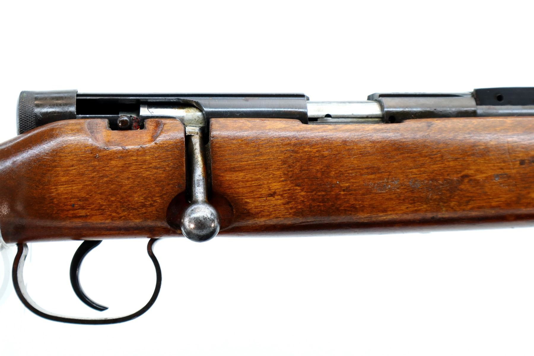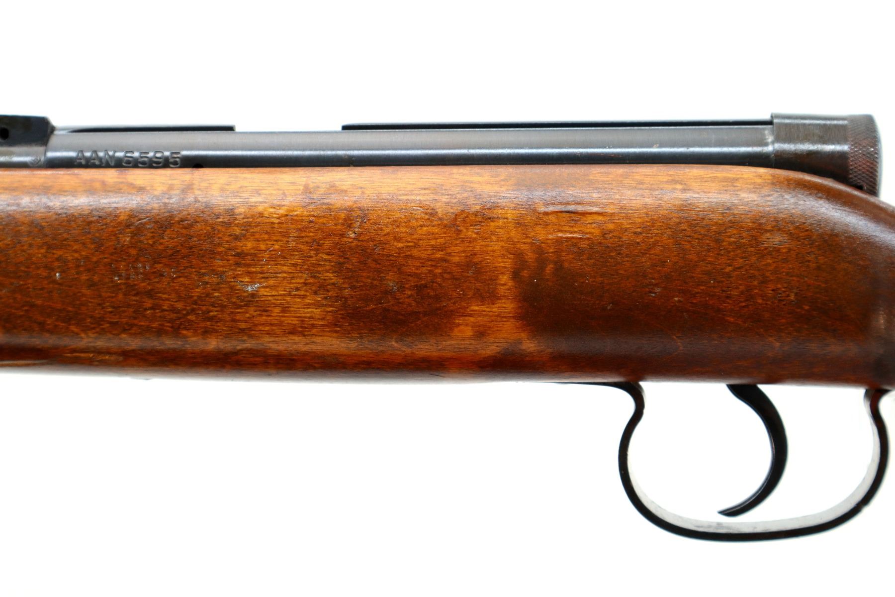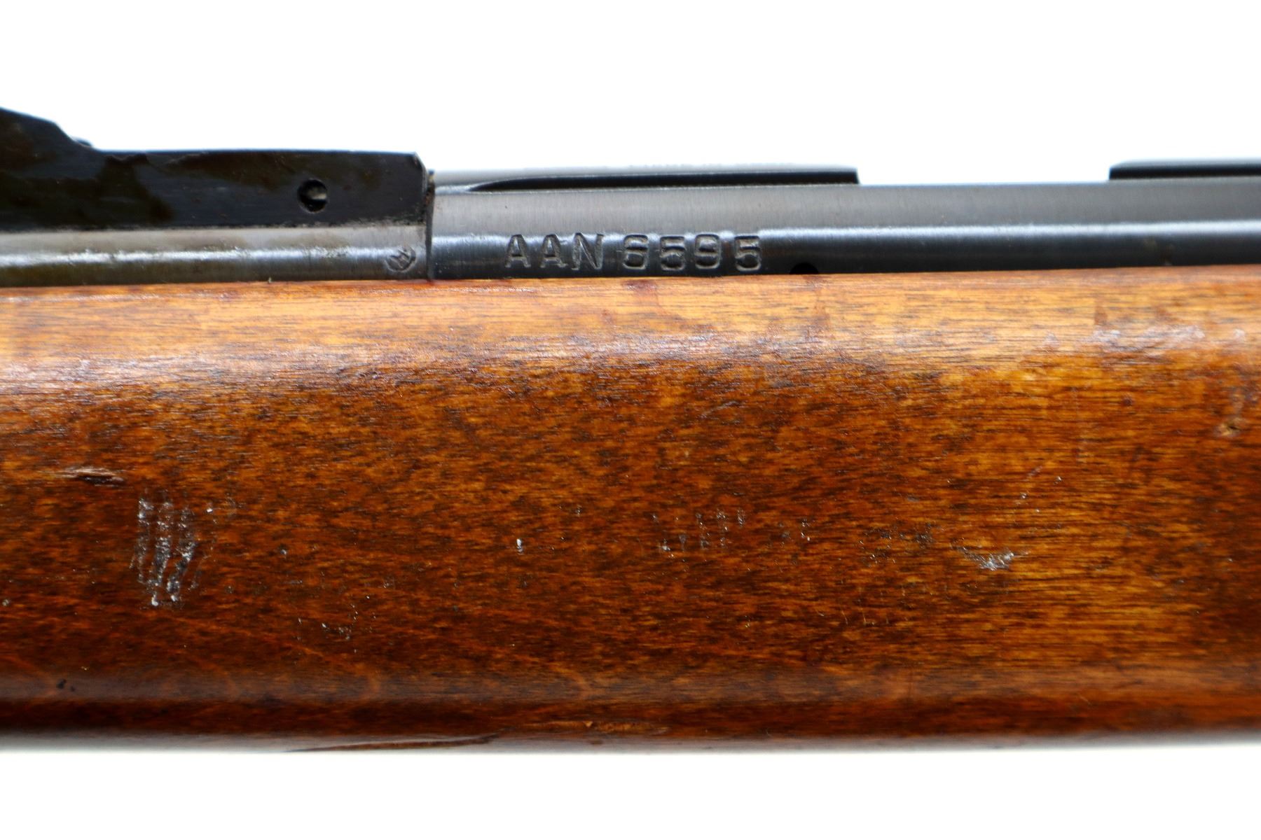Main Description: Post front sight with hood and ramp, missing rear sight base is present, blued finish, heavy barrel, grooved receiver, smooth bolt knob. One piece wood stock, checkered pistol grip, grooved brown polymer butt plate, swivel studs.