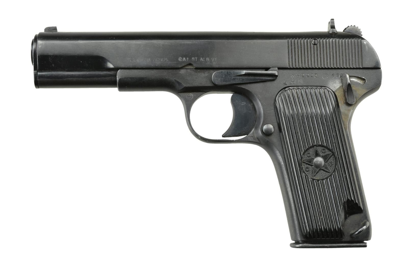 Cal. 7.62x25. S #ZHM2203 Bbl. 4 1/2". Arsenal renumbered matching number on slide & bbl. Left side of slide has import marking & importer translated serial number prefix. Left side of frame has Izhevsk symbol w/ a 1950's date that is indiscernible due to importer (CAI) added safety. CCCP grooved grips w/ star. MAGS: 1 factor 8 round numbered "2971". CONDITION: grips show a couple light chips on right panel & some handling wear. Metal retains 90% arsenal rework blue w/ some discoloration around both sides of frame where safety was added & some light freckling. Very good bore w/ light frosting. (22-2406/MJC). CURIO. $100-200.