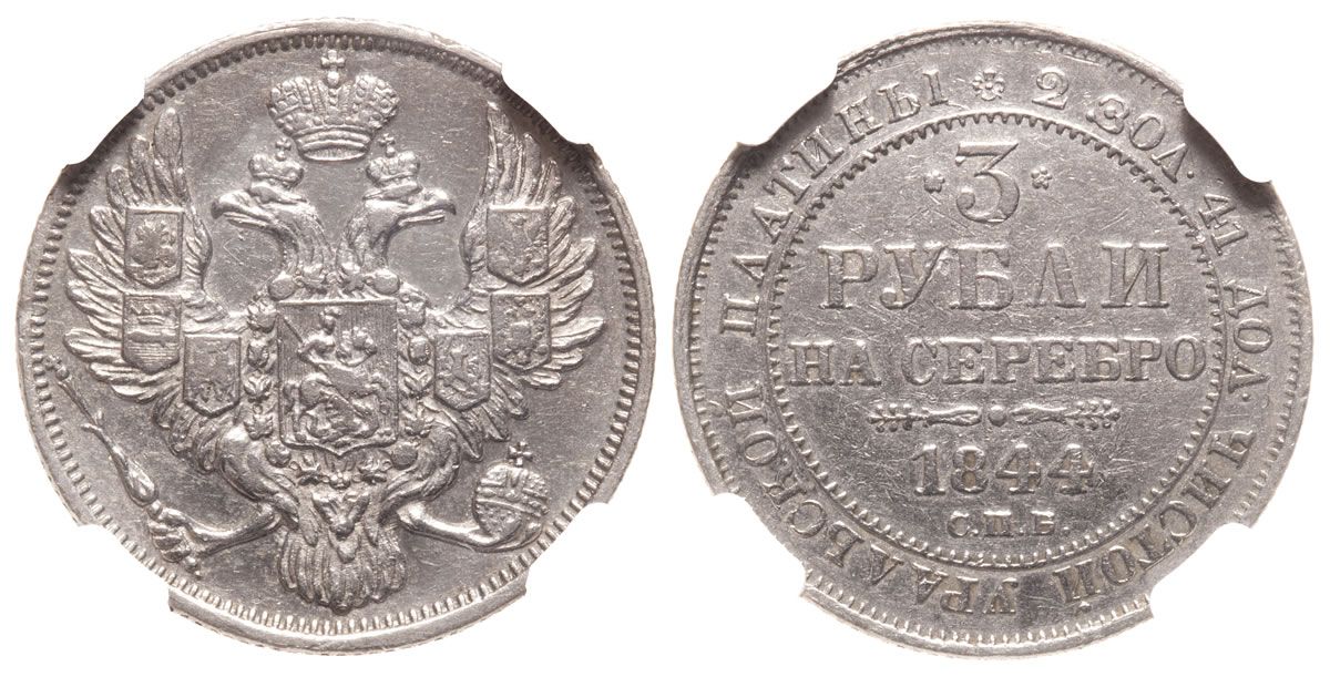 3 Roubles 1844 CΠБ. C.177. Platinum. NGC graded Choice Extremely Fine-45.