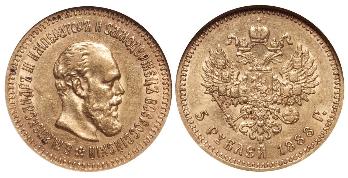 5 Roubles 1888 AГ. Y.42. Gold. NGC graded Choice Extremely Fine-45.