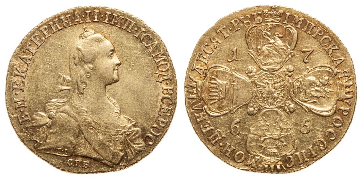10 Roubles 1766 CΠБ. C.79a. Gold; St. Petersburg Mint. Catherine II crowned bust right; Crowned shields in cruciform with date in angles. Oblique milling. Uncirculated.