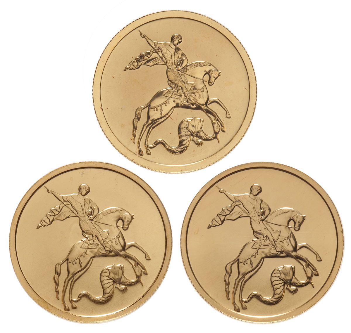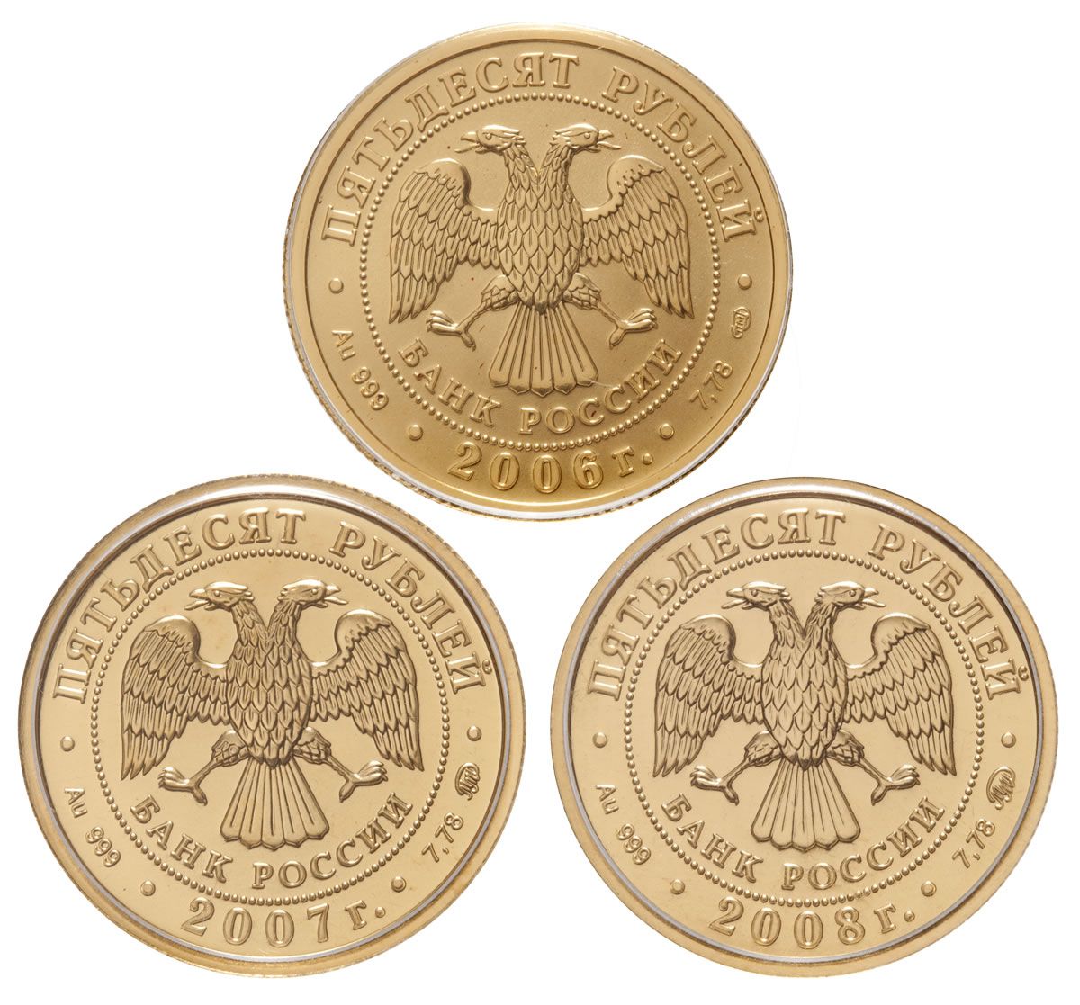 50 ROUBLES 2006, 2007, 2008. Y.1049. .999 gold, 7.78g ea., .2499 oz AGW ea.; .7497 oz AGW total. GUNC-65 . Lot of Three (3) pcs.