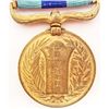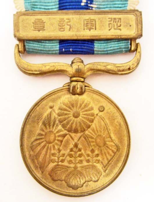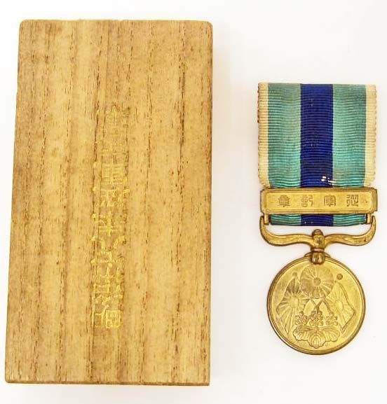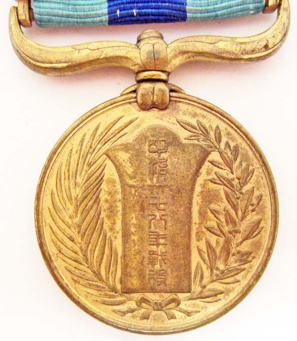 Includes the original presentation box! The medal is a light gilded bronze. The attached bar reads 'War Medal.' The front shows crossed flags in the center. The Imperial Mum crest is above and the Imperial paulonia crest below. The other side features a Japanese shield inscribed 'Meiji 37-8 [1904-5].' There is a branch on either side. To the right is a laurel and to the left a palm.