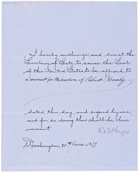 June 30, 1879-Dated, Document Signed, “R. B. Hayes” as President, Washington, D.C., measuring 10” x 8”, 1 page, tri-fold, Choice Extremely Fine. President Hayes signs a Warrant Document authorizing the Secretary of State to affix the Seal of the United States to “a warrant for the pardon of Robert Mosely.” Trivial tone to this original, period pale blue page. Signature “R.B. Hayes” as President is strong and clear, in brown ink. A scarce Presidential Pardon Document.