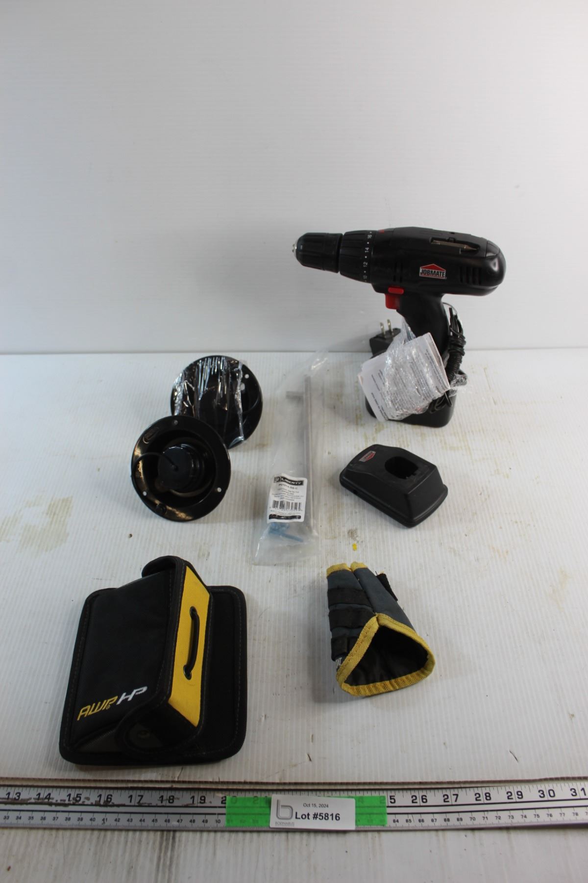 RV Fuel Tank Caps, Jobmate Cordless Drill with Charging Station - Tested, Steel Bar Pull and Tool Pouches