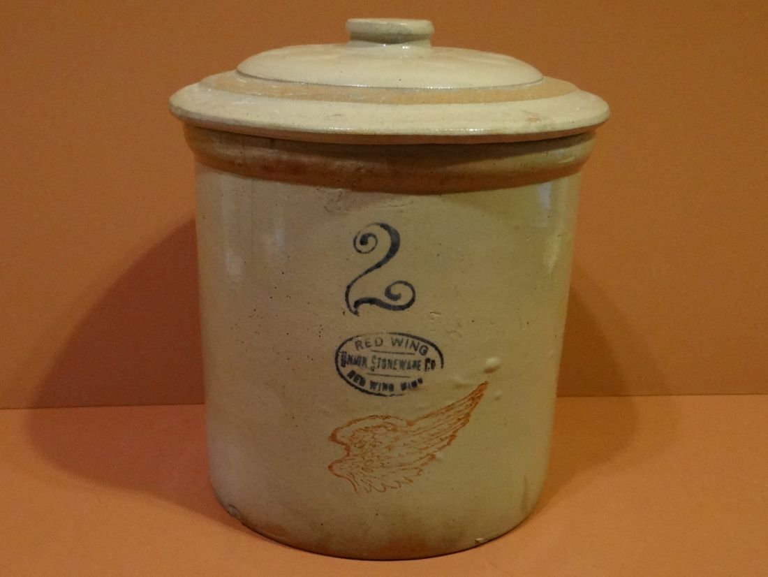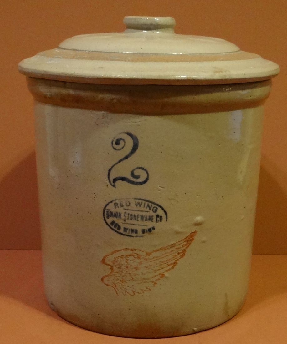 RW 2 gal. crock, 4" wing w/ lid, small chip on bottom