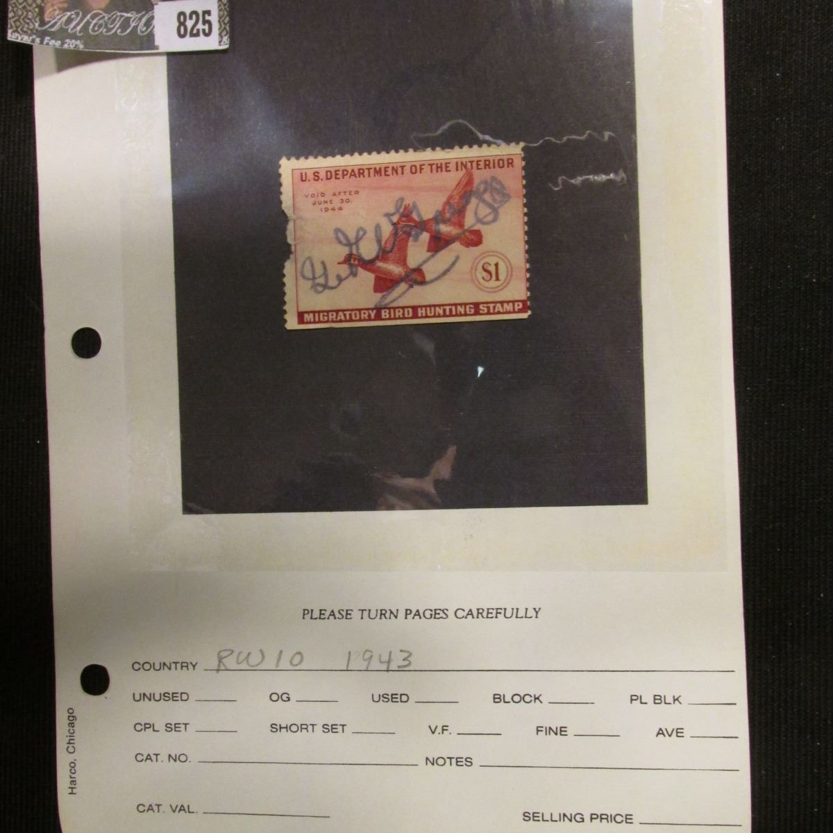 RW10 1943 U.S. Department of Agriculture Migratory Bird Stamp. Used with Signature.