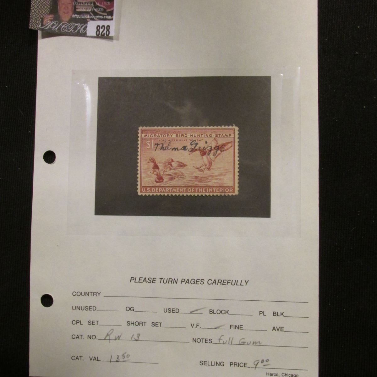 RW13 1946 U.S. Department of Agriculture Migratory Bird Stamp. Used, VF, full gum.