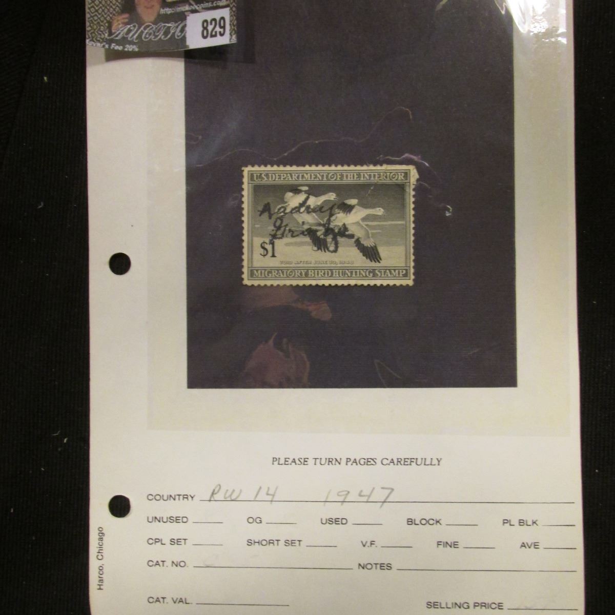 RW14 1947 U.S. Department of Agriculture Migratory Bird Stamp. Used, Fine, partial gum.