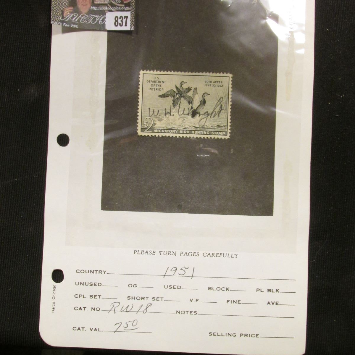 RW18 1951 U.S. Department of Agriculture Migratory Bird Stamp. Signed, Fine.