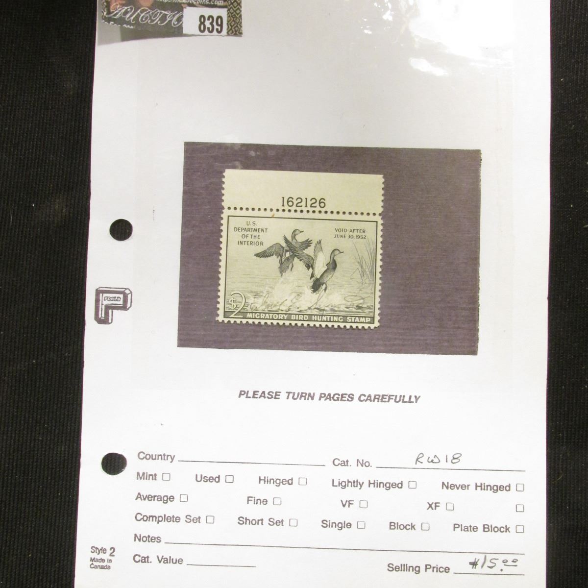 RW18 1951 U.S. Department of Agriculture Migratory Bird Stamp with Plate number. Signed, Fine.