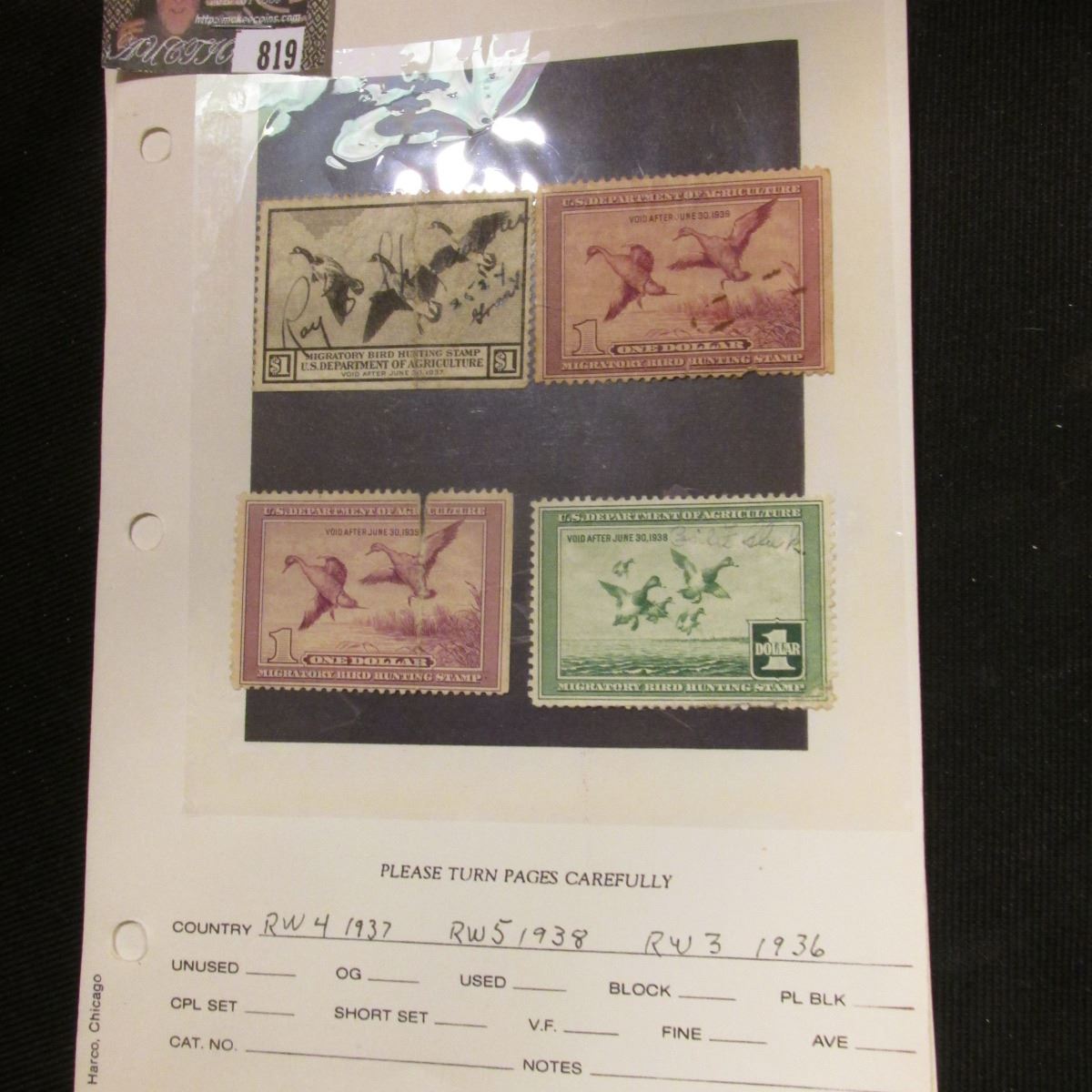 RW3 1936 Signed; RW4 1937 Signed; & (2) RW5 1938 (Unsigned, but damaged) U.S. Department of Agriculture Migratory Bird Stamps.