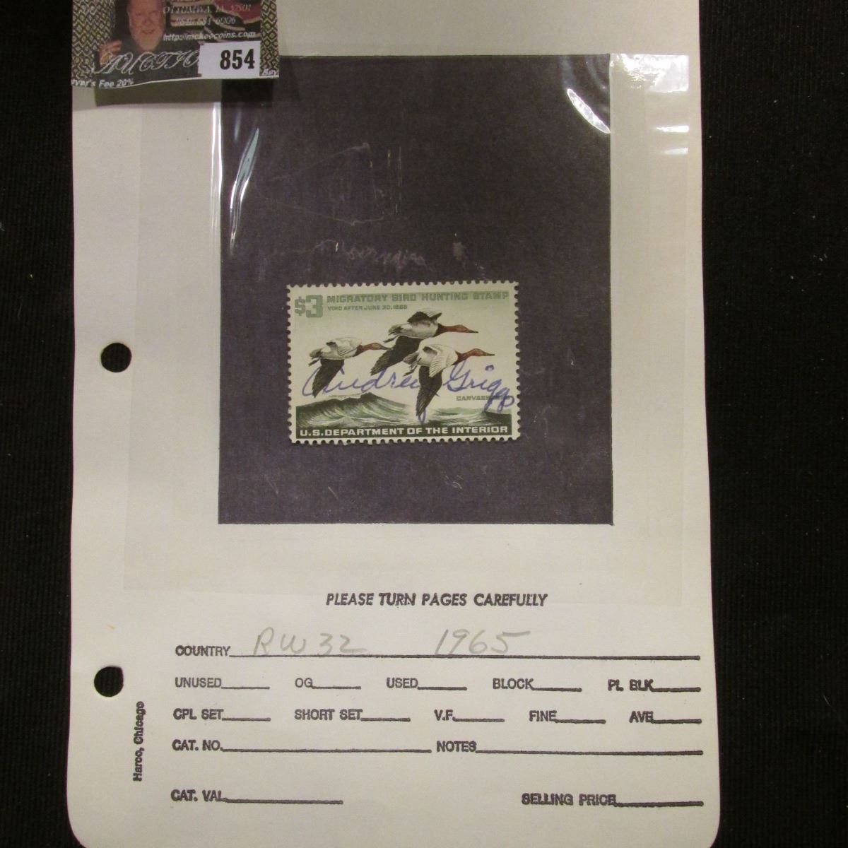 RW32 1965 U.S. Department of Agriculture Migratory Bird Stamp, Fine, signed.