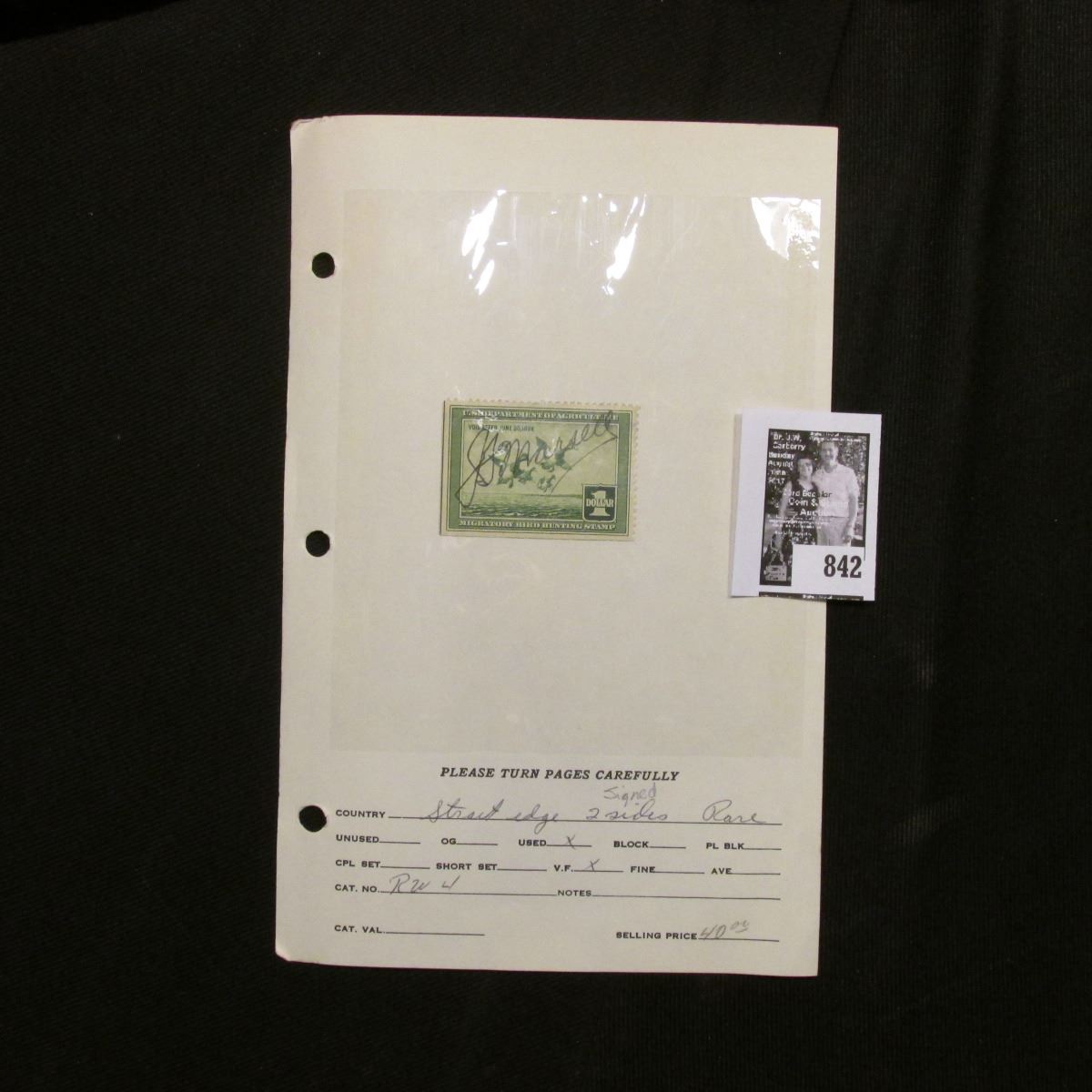 RW4 1937 Federal Migratory Bird Hunting and Conservation Stamp, signed, Straight edge on 2 sides. Rare.