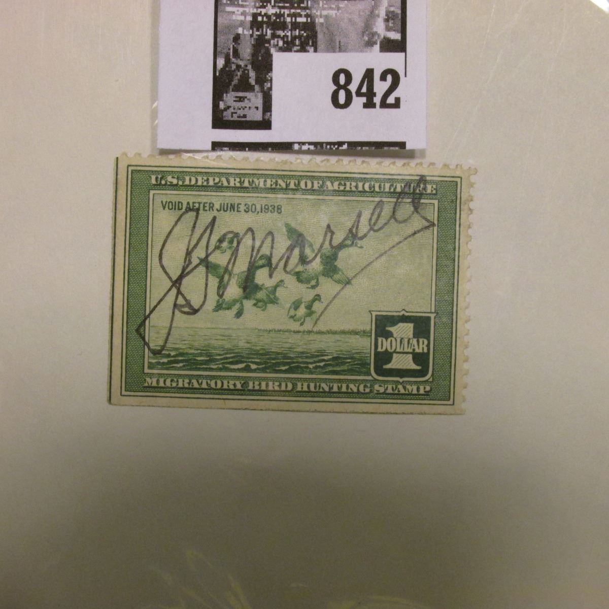 RW4 1937 Federal Migratory Bird Hunting and Conservation Stamp, signed, Straight edge on 2 sides. Ra