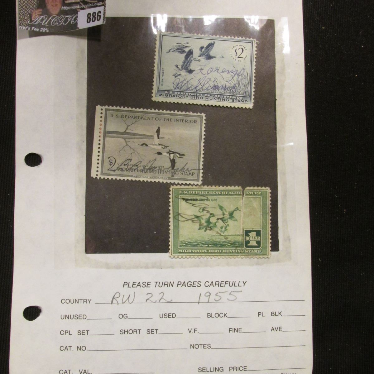 RW4 1937, RW22 1955, & RW23 1956 U.S. Department of Agriculture Migratory Bird Stamps, all used and signed.