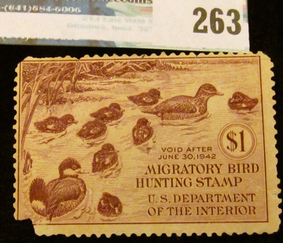 RW8 1941 Federal Migratory Bird Hunting and Conservation Stamp, not signed, no gum. Lower left corner damage.