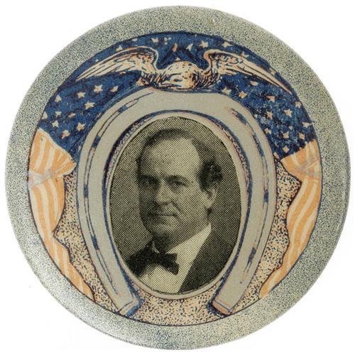 <B>Magnificent Red, White, Blue, and Silver William Jennings Bryan Button Design, with 1900 Pose.</B></I> This large 1 1/2" design, featuring Bryan in a silver horseshoe, is one of the top single-picture button designs of that rich era. Only a few copies are known, and it is hard to image that any could surpass this perfectly centered beauty. <I>From the Norman Loewenstern Collection.</B></I>