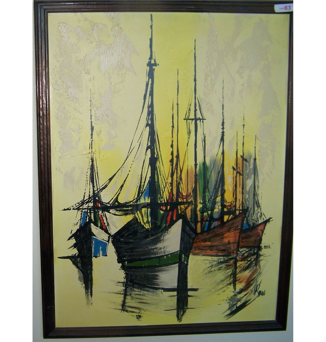 RYAN ORIGINAL MID-CENTURY MODERN STYLE PAINTING ON BOARD. NICELY FRAMED