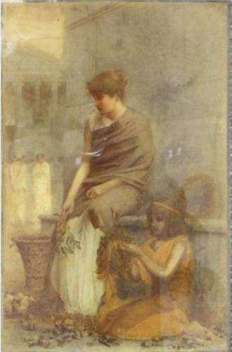 RYLAND, Henry, 1856-1924. "A Young Mother and Daughter selling Garlands". Peinture sur verre, signée. École anglaise. Reverse painting on glass, signed. English School. 10 1/2" x 6 3/4" - 26.6cm x 17.1cm.