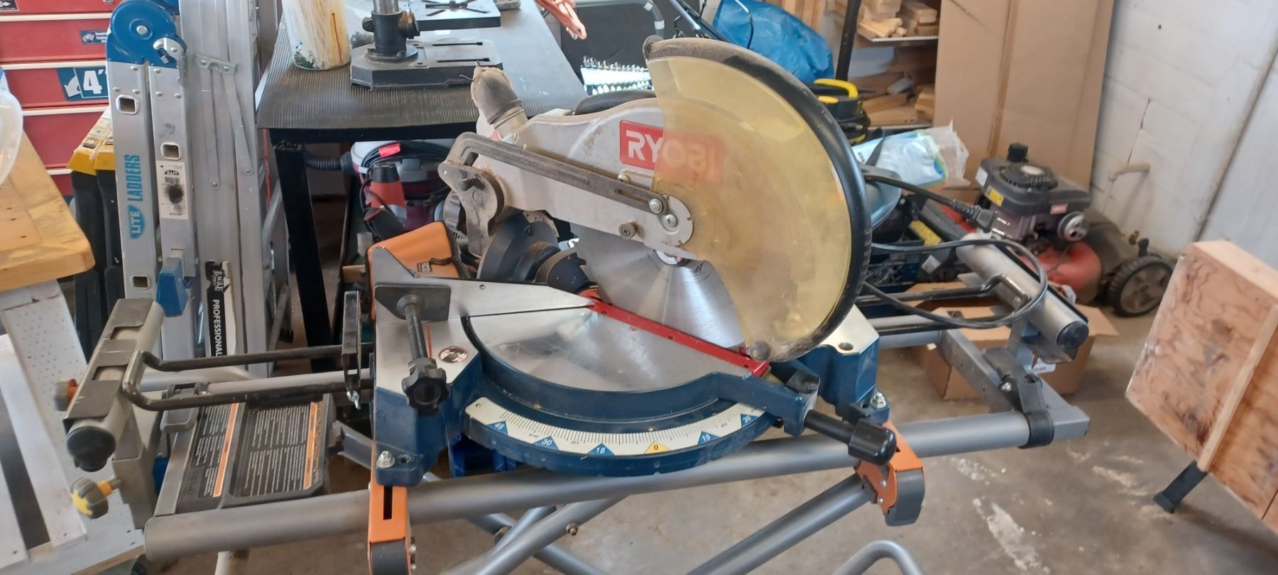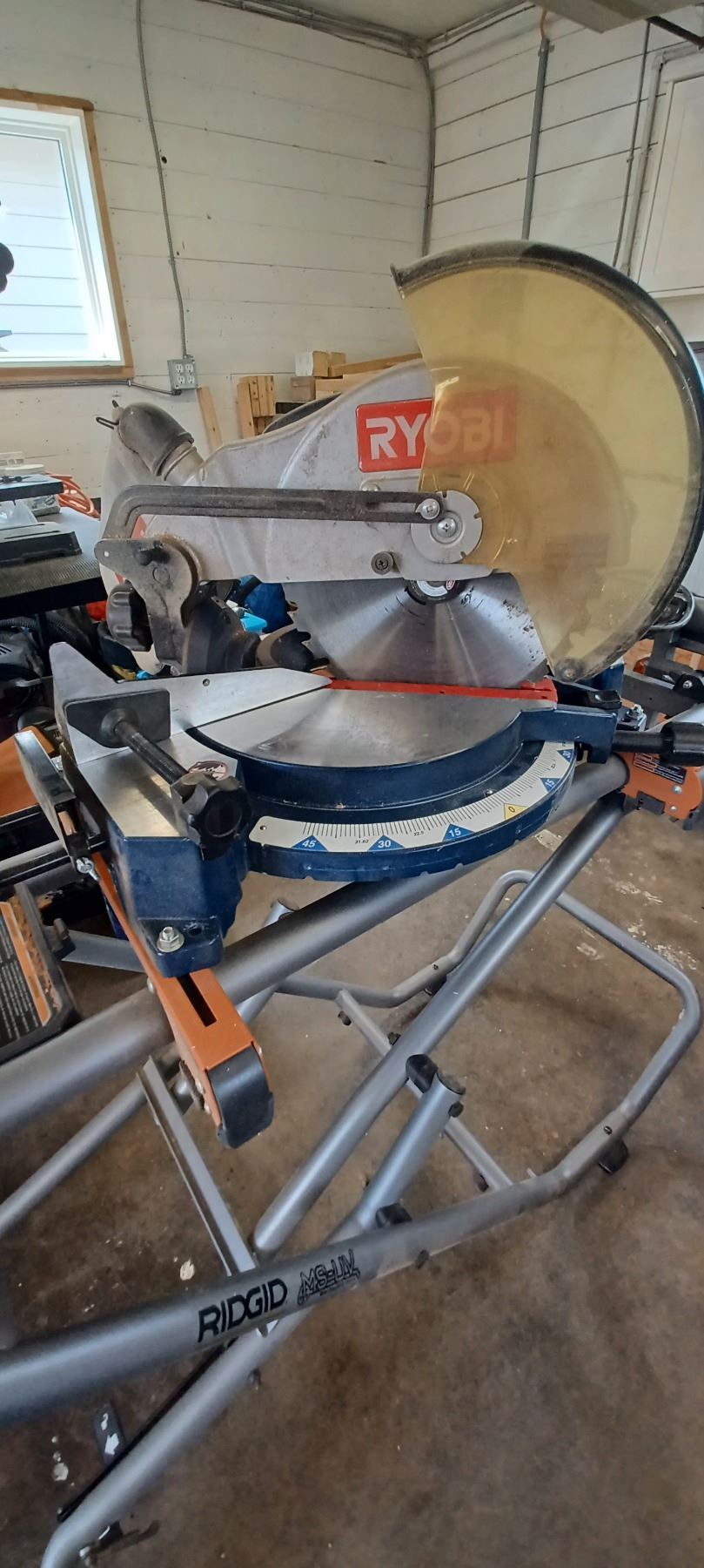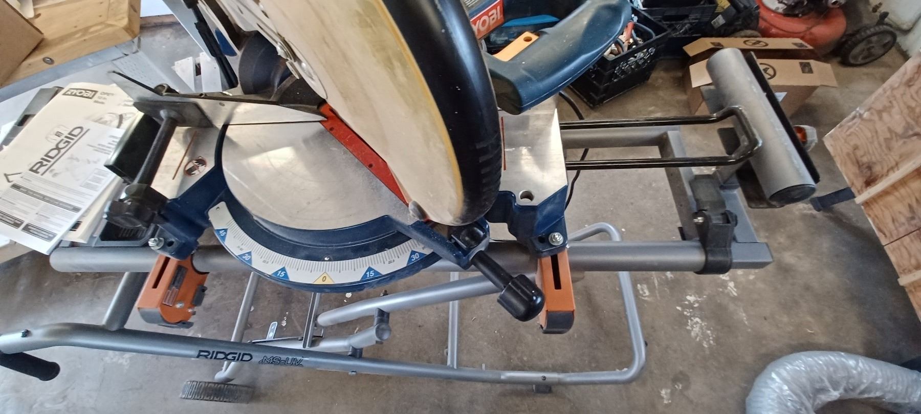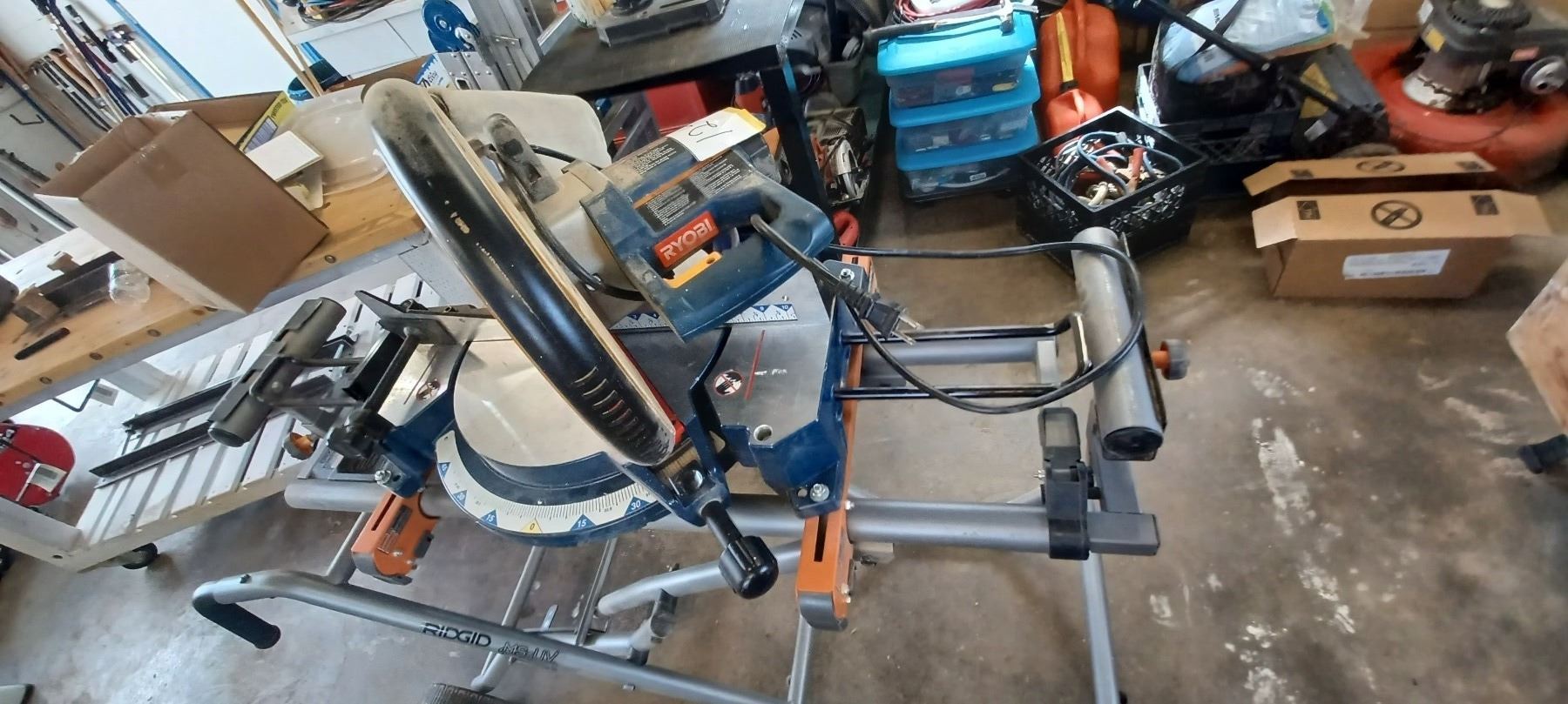 RYOBI 12" COMPOUND MITRE SAW COMES WITH RIDGID MITRER SAW UTILITY STAND-GOOD SHAPE