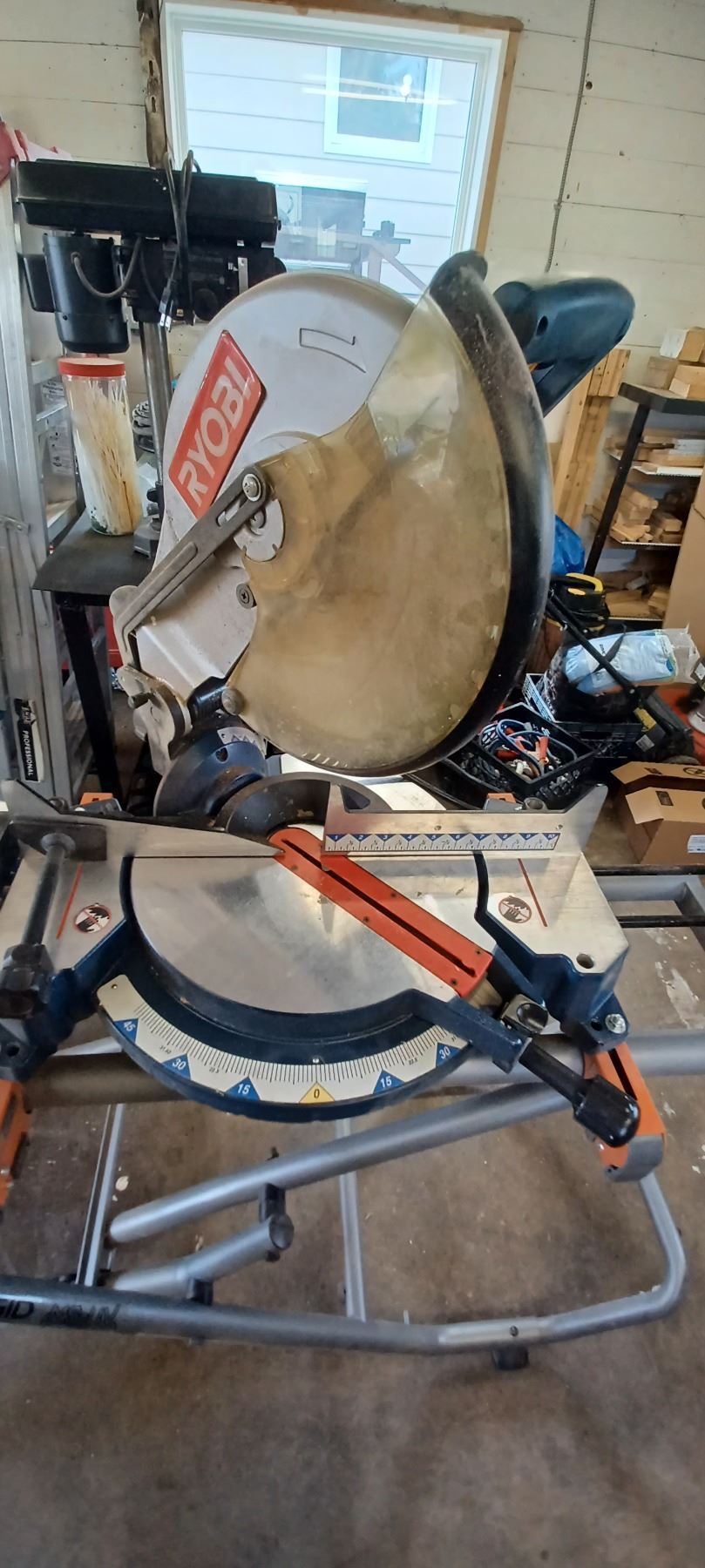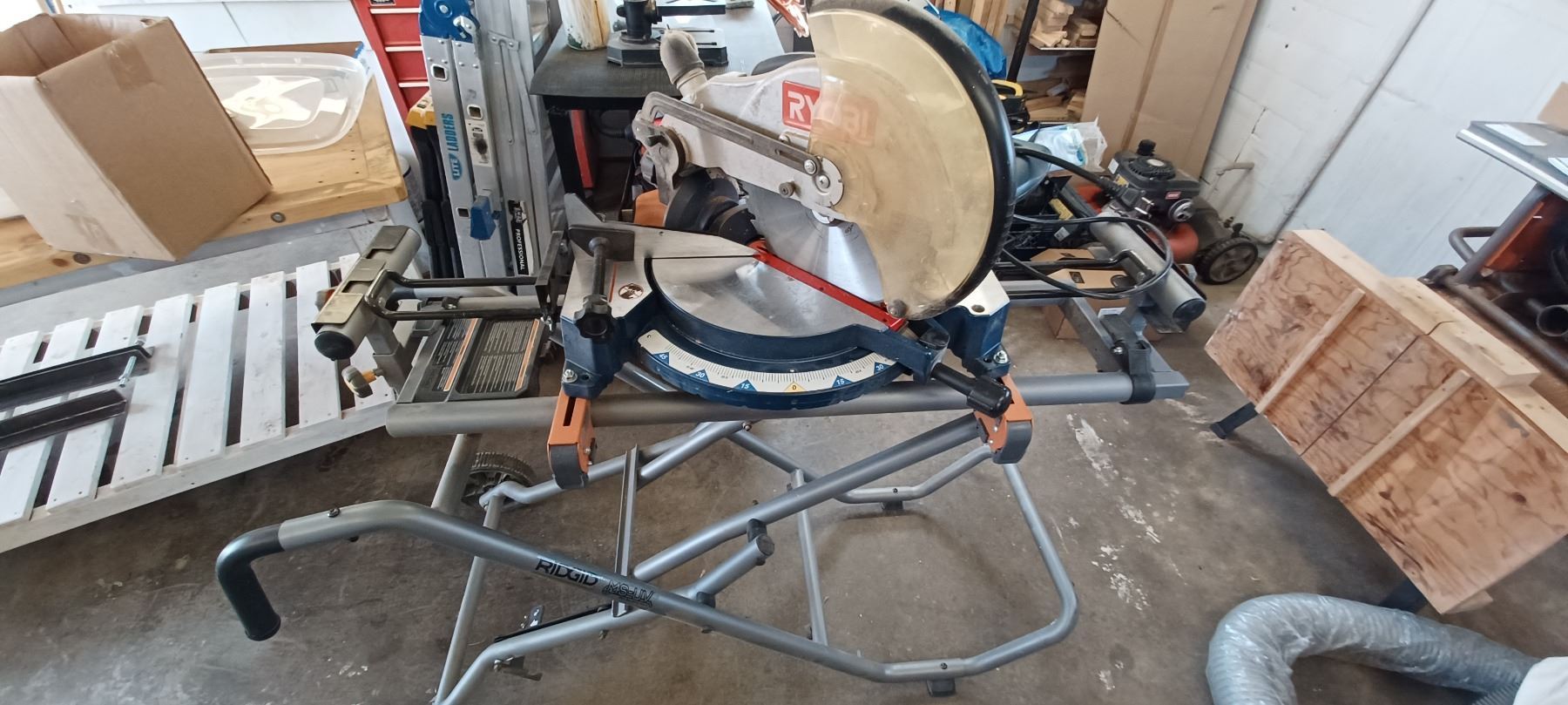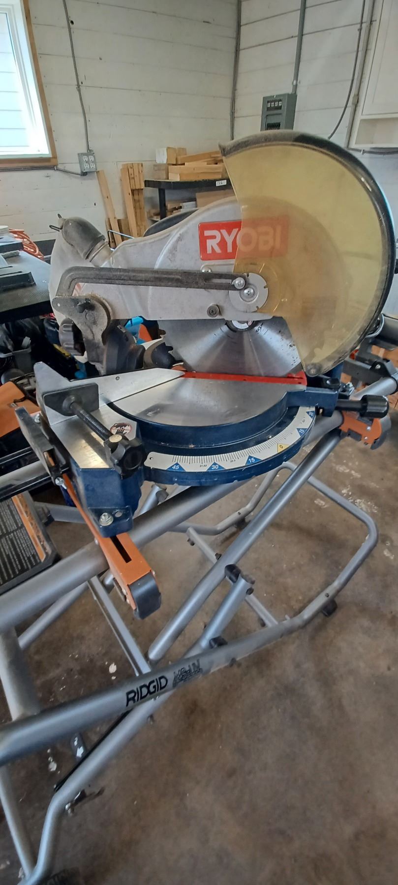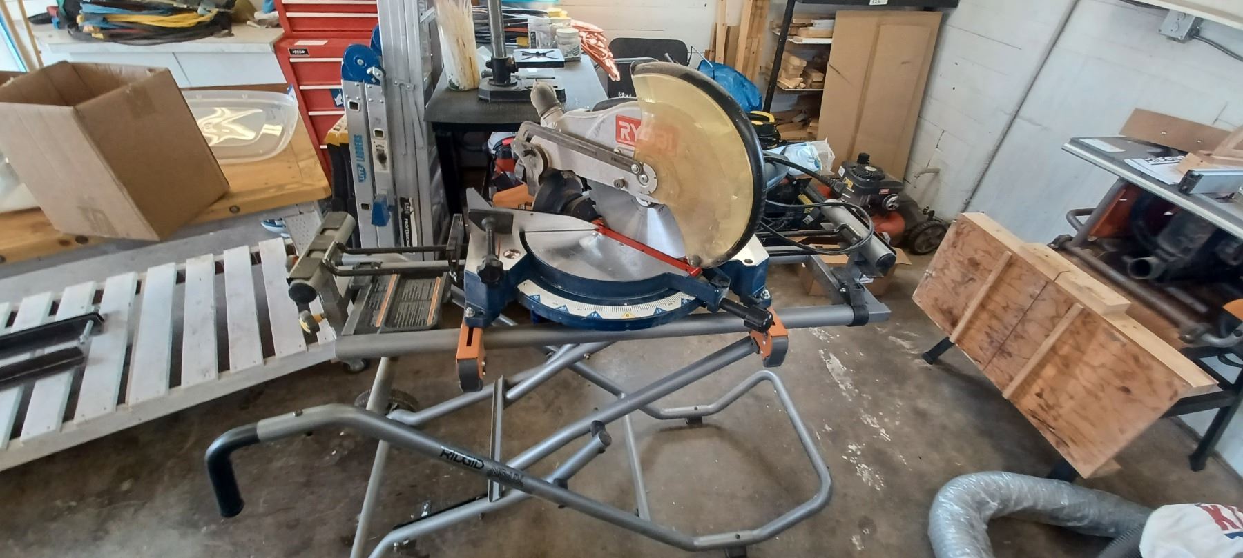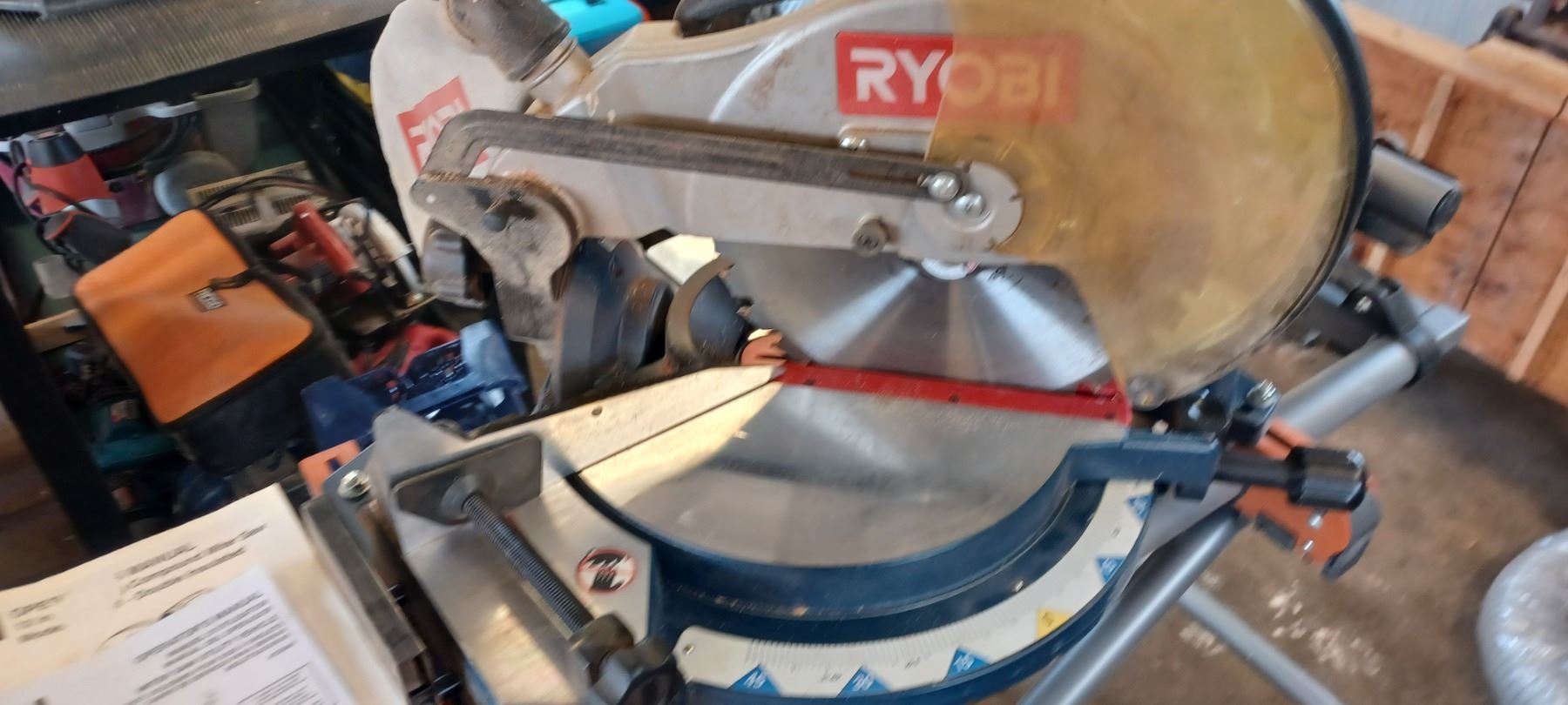 RYOBI 12" COMPOUND MITRE SAW COMES WITH RIDGID MITRER SAW UTILITY STAND-GOOD SHAPE
