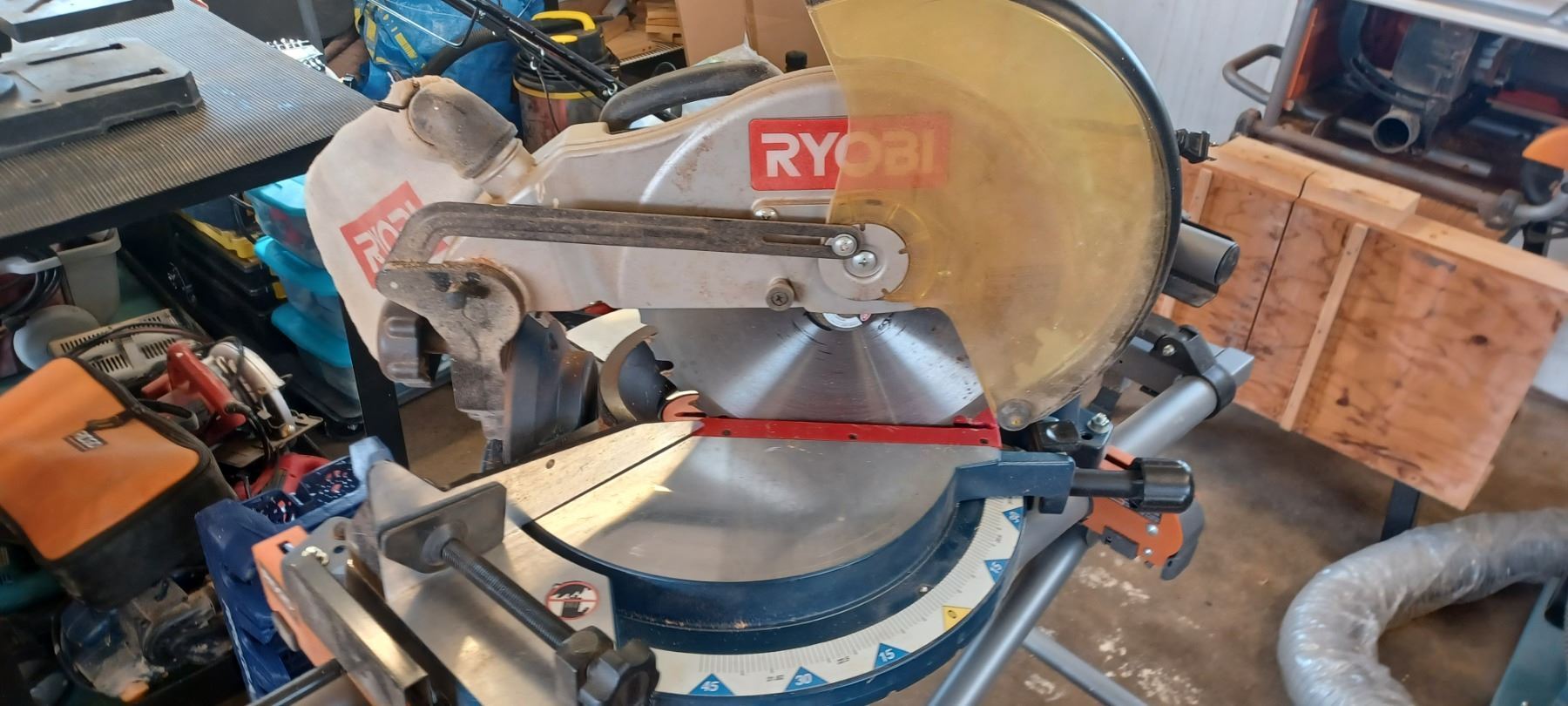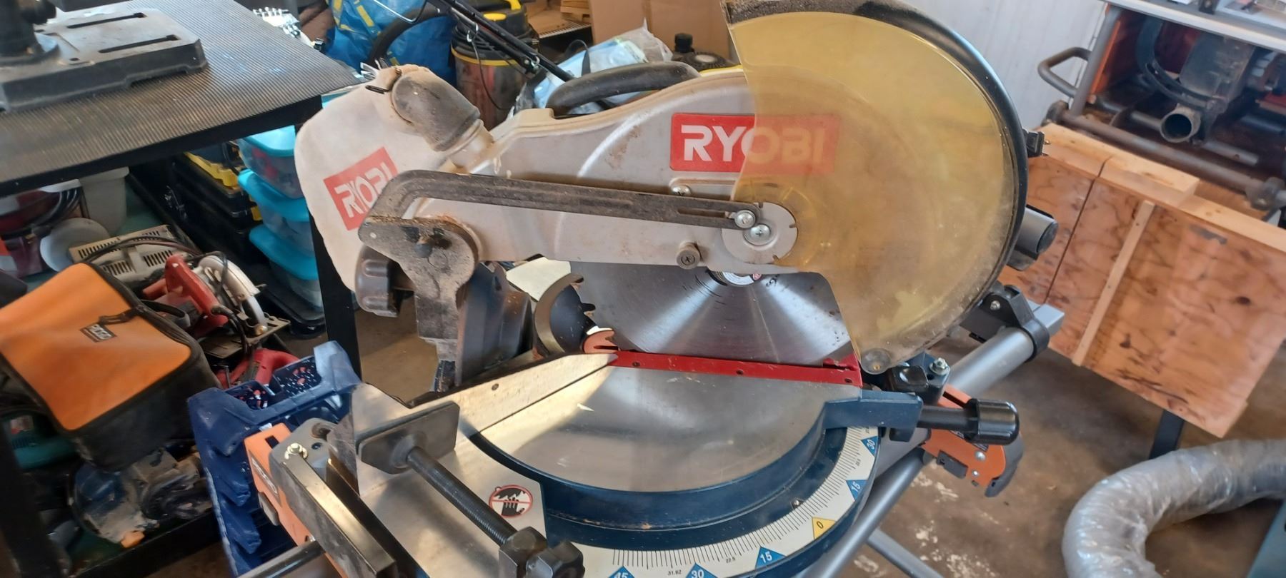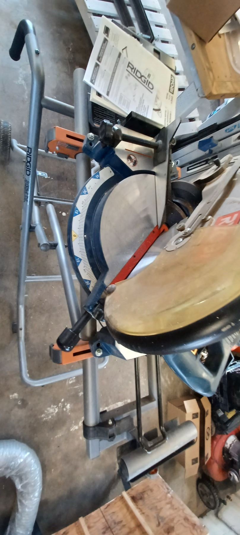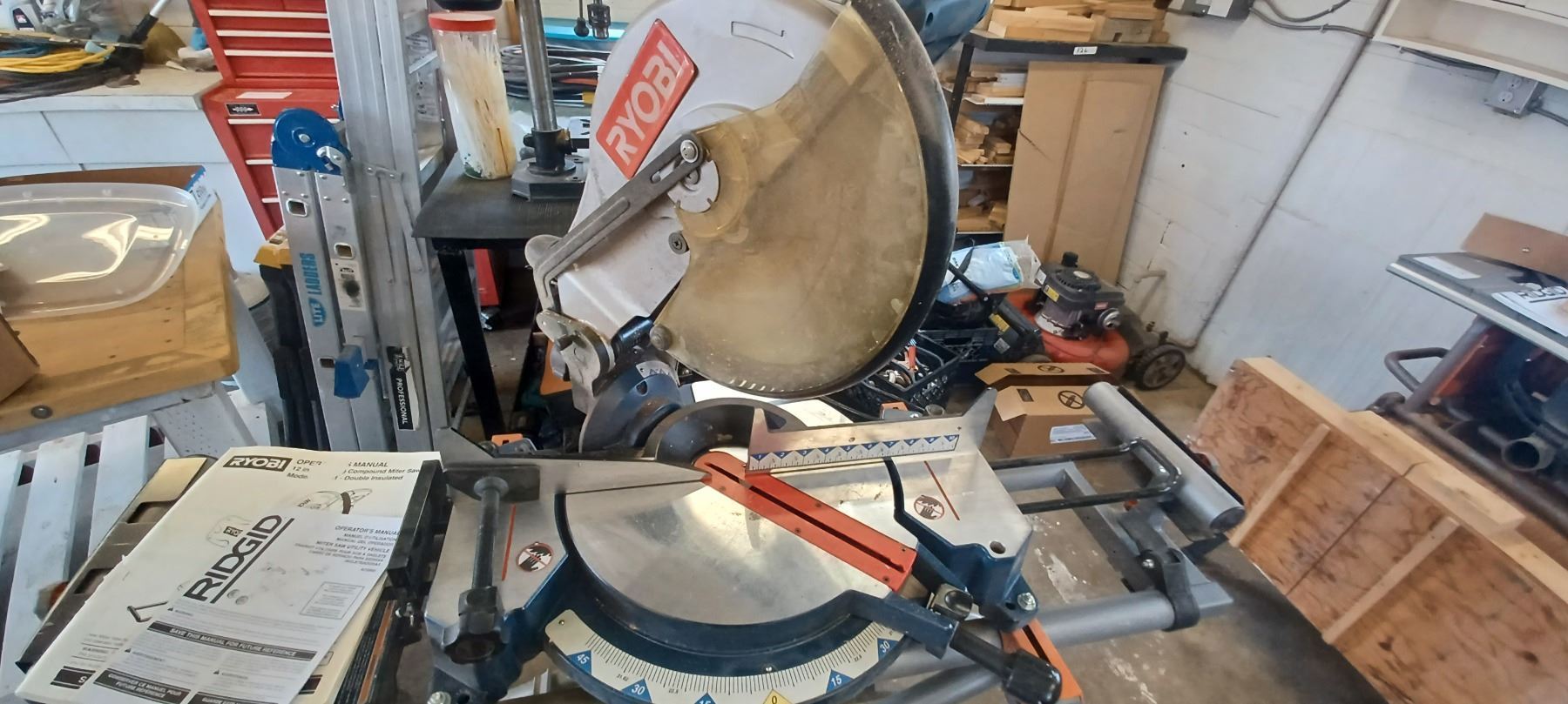 RYOBI 12" COMPOUND MITRE SAW COMES WITH RIDGID MITRER SAW UTILITY STAND-GOOD SHAPE