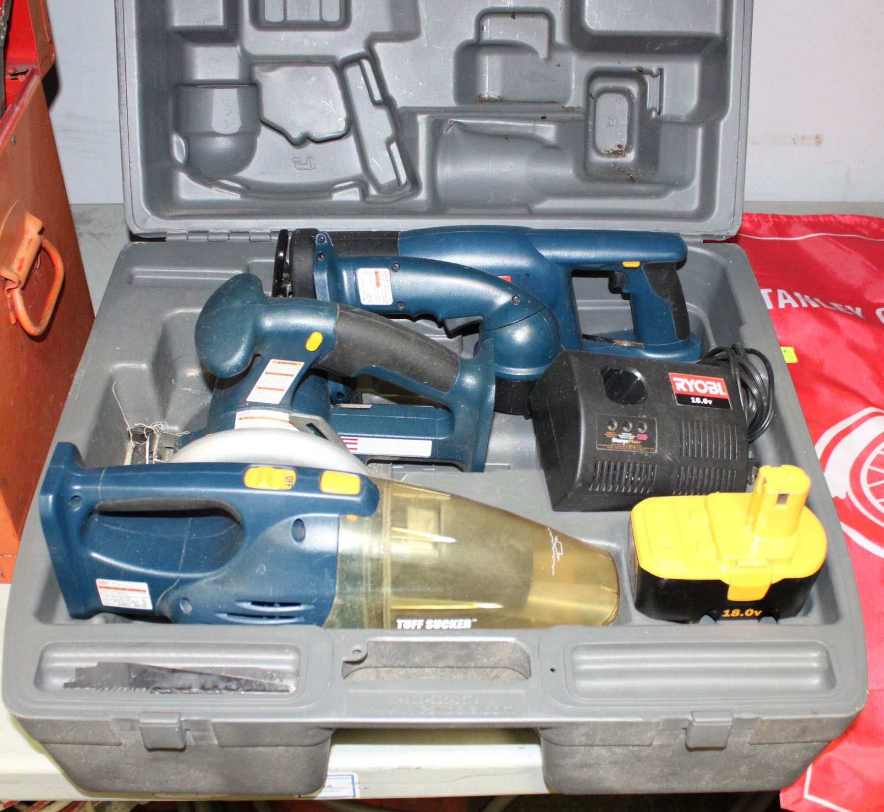 RYOBI 18V CORDLESS SAW, VACUUM, FLASHLIGHT AND