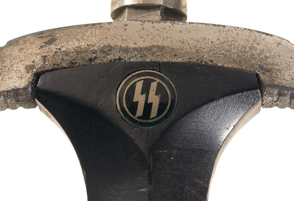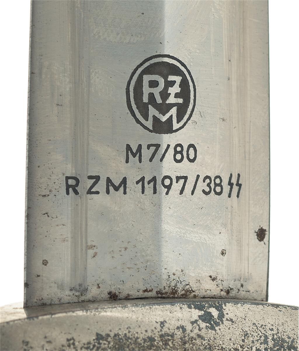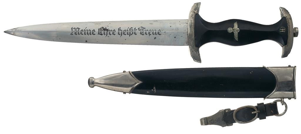 Measuring 13 3/4 inches overall, the 8 5/8 inch double edged spear point blade is etched "Meine Ehre heisst Treue" (My Honor is Loyalty) on the obverse, and the reverse is etched with the "RZM" logo, "M7/80" and "RZM1197/38(SS runes)". The guard and pommel are both nickel finished, with an alloy Nazi Eagle and a black and silver enamel SS badge set into the blackened hardwood grip. With a black enamel finished sheath with nickel finished throat and tip, a leather hanger stamped "(SS runes) 38/38 RZM" and a "M5/8" (Assmann and Sons) marked clip.
