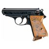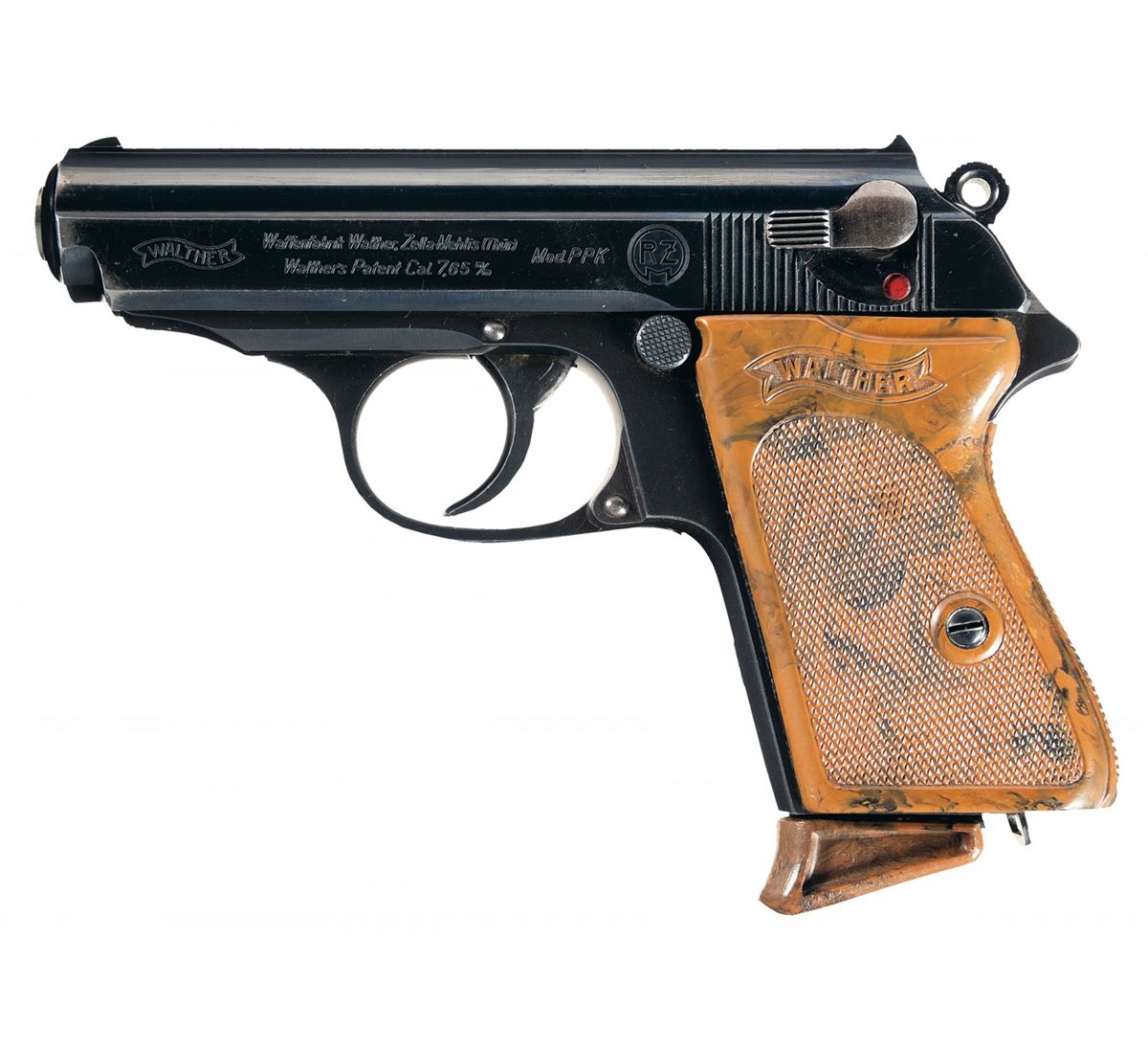 The left side of the slide is marked with the Walther banner followed by the two line address/caliber designation, "Mod. PPK" and the circled "RZM" control mark. The Reichs Zeugmeisterei (RZM) served as the quartermasters office of the SA and National Socialists prior to WW II. Commercial "crown/N" proofs marked on the slide, chamber and barrel. The pistol has the high polish commercial blue finish and is fitted with one piece brown plastic wraparound grips with checkered panels and the Walther Banner at the top. The slide has a cocking indicator pin and a 90 degree safety lever. Blue magazine with the Walther banner and a grip extension.