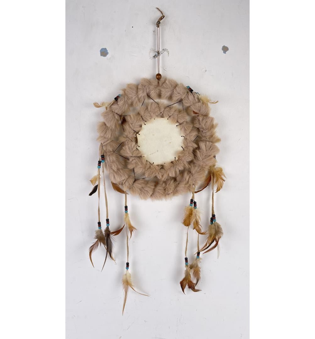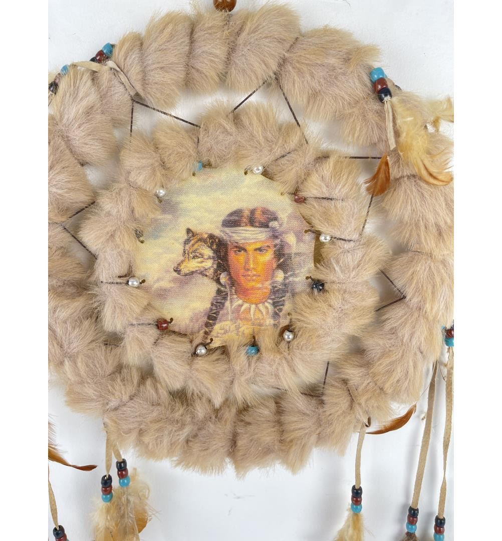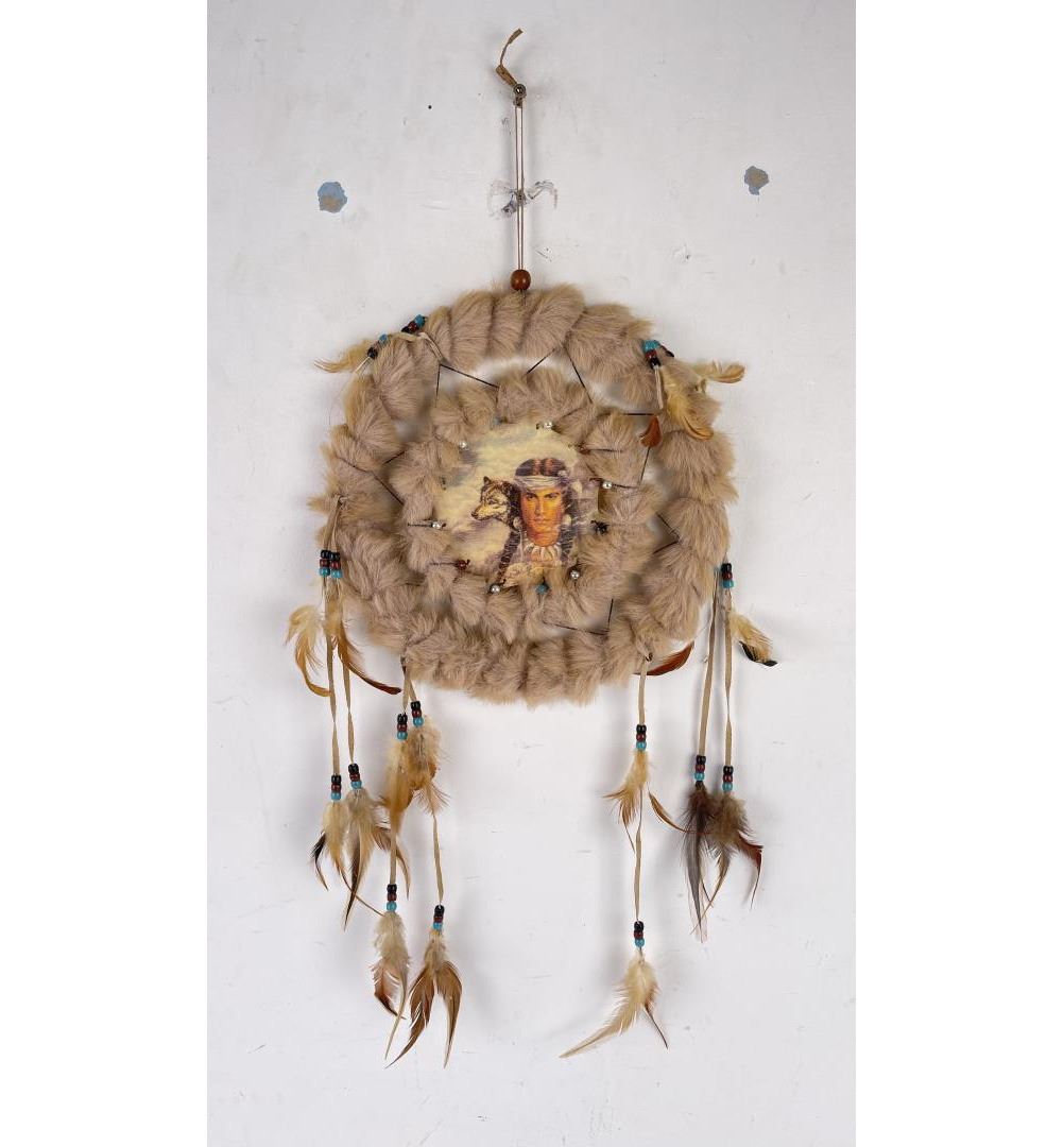 Measures approximately 11" in diameter. Painted center image depicts Native American and a lone wolf.
