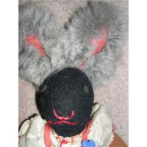 like they are sawdust stuffed. Her body and head are very hard. She is well made. There is one spot on the back of her dress near the hem that is soiled. If you are into something different, then you might consider this rabbit girl.