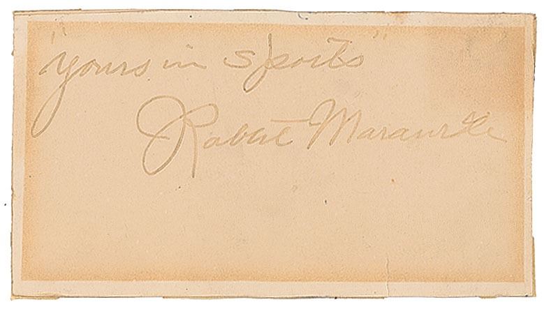 Vintage fountain pen signature, "Yours in sports, Rabbit Maranville,” on an off-white 4.75 x 2.75 sheet. Affixed to a same-size mount. In very good to fine condition, with toning and fading from prior display. Accompanied by a full letter of authenticity from JSA.