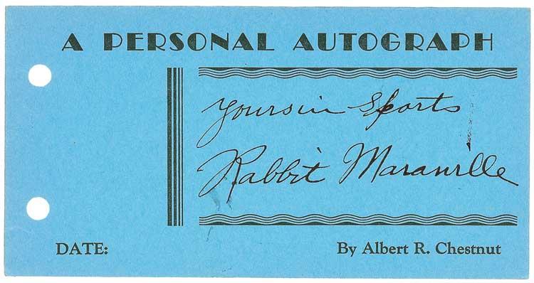 Baseball Hall of Famer. During his 23-year career as an infielder (1912-1935), mostly with the Boston Braves, he established many fielding records with his colorful play, including most lifetime putouts by a shortstop (5,133). Vintage fountain pen signature, “Yours in sports, Rabbit Maranville,” on a 5.5 x 2.75 blue card from the Albert R. Chestnut collection. A couple of small ink smudges, otherwise fine condition. From his Pennsylvania home, Chestnut, a printer by profession, began collecting autographs in 1935. He sent these personally-printed cards to over a thousand celebrities and received favorable replies from the vast majority, finally retiring from collecting to raise his family when postage increased from 2¢ per card! Pre-certified Steve Grad/PSA/DNA and RRAuction COA.