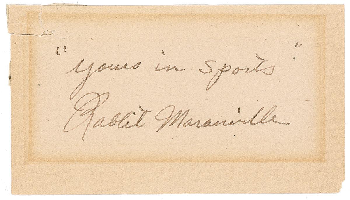 Baseball Hall of Famer. During his 23-year career as an infielder (1912-1935), mostly with the Boston Braves, he established many fielding records with his colorful play, including most lifetime putouts by a shortstop (5,133). Vintage ink signature, “’Yours in sports’ Rabbit Maranville,” on an off-white 4.5 x 2.5 slip. Repaired tear to top left corner, which could be matted out, and a uniform block of mild toning from previous display, otherwise fine condition.