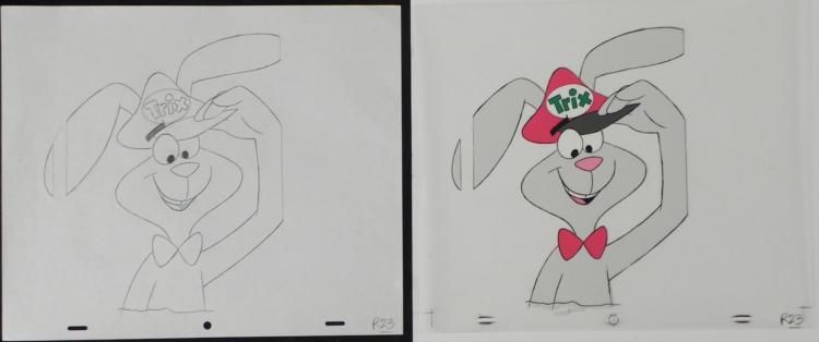 In this cel/drawing, the Trix rabbit is wearing a trix hat and a red bow tie. This original animation cel & drawing are from the production of the Trix cereal commercial. * * * Original Animation Cel & DrawingMedium: Hand painted acetate celDetails: Animation notations and peg holes * * Original "rough" animation drawing, in non-photo blue and black pencil * * Size of cel: 10 1/2 x 12 1/2 inchesSize of drawing: 10 1/2 x 12 1/2 inches * * Condition: Very good * This is an original hand-painted cel set-up used in the production of the "Trix Cereal Commercial." Each one-of-a-kind set-up represents a slight change in position of the characters. When individually photographed and projected in rapid succession, the images * appear to move. To created production cels, the original animator's drawing is transferred onto an acetate cel (by hand-inking and/or photo copying). The cel is then hand-painted on the reverse side. * * * * Traditional animation is a multi-step process which includes various types of art techniques. Drawings are a key part of the process, in which the animator creates the design and movement of the characters. Drawings are then transferred onto acetate cels.